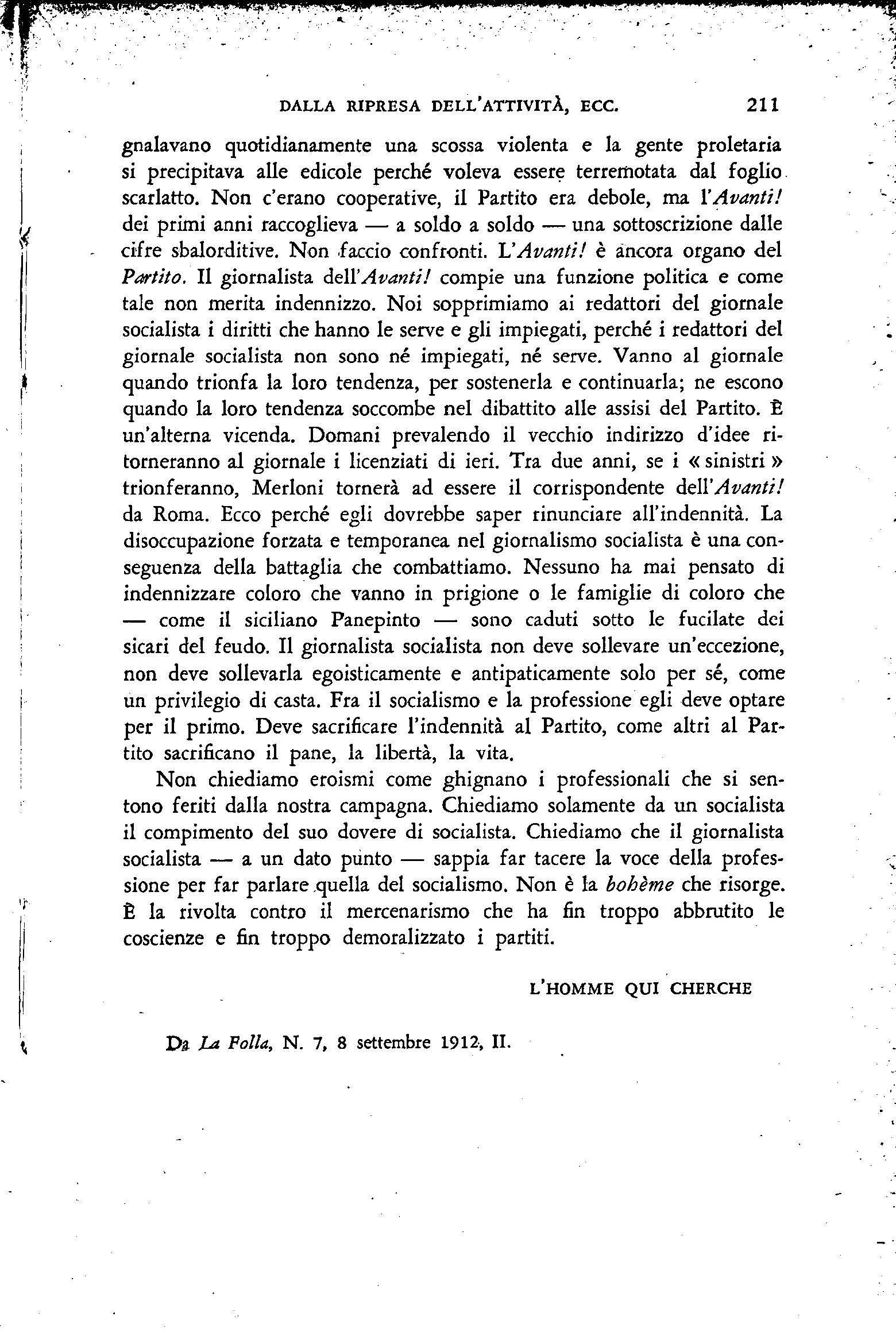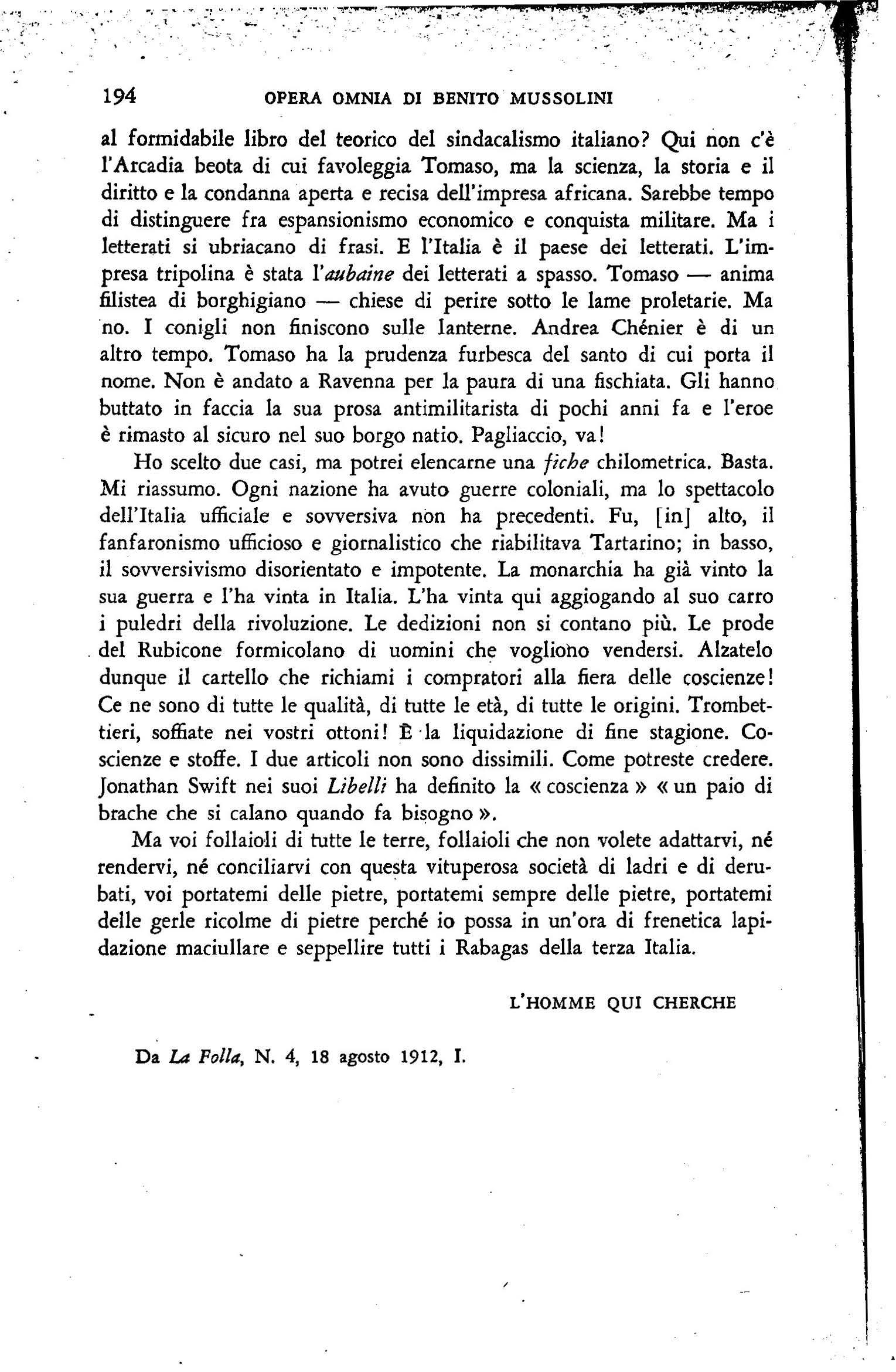 G li scritti fumati L'H omme qui rherthe sono attribuiti a Bmito Mwsolini da Paolo Valera in: M,uwlini (Milano, Casa Editrice « La Folla,>, 1924), J ove, a pag 49, si legge: « L'Homme qui rherrhe de Ltt Folla. Sono articoli ambientati, scritti da Bmito Mussoliai nei stratagli del suo tempo. ( +) ».