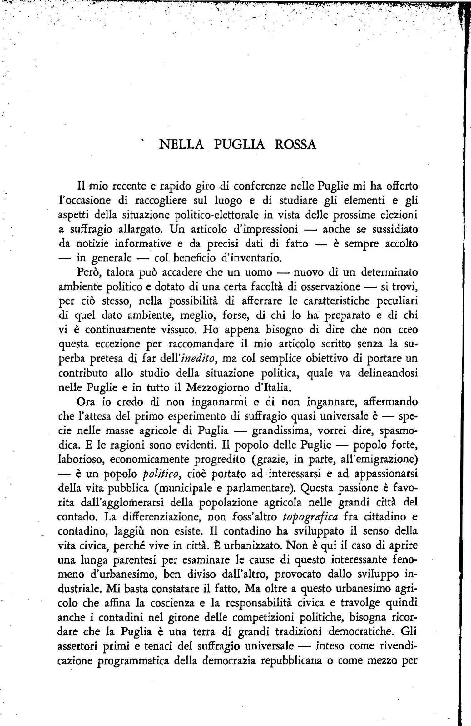 Piuttosto se vogliamo migliorare sul serio il nostro ambiente politico guardiamoci dalle esagerazioni specu latrici che imbestialiscono e non educano le folle. Certi incidenti, quasi normali, e comunque t rascurabili, non vanno iugrussati sino alla deformazione falsa, settaria e idiota E non ficchiamo 'il socia lismo e la repubblica là dove - tutto al piùsi può onestamente parlare di a lbana e sangiovese. Non e leviamo agli onori del« conflitto politico» ogn i qualsiasi pugilato tra i frequentatori delle bettole paesane .. .. O al trimenti faremo ridere ,...