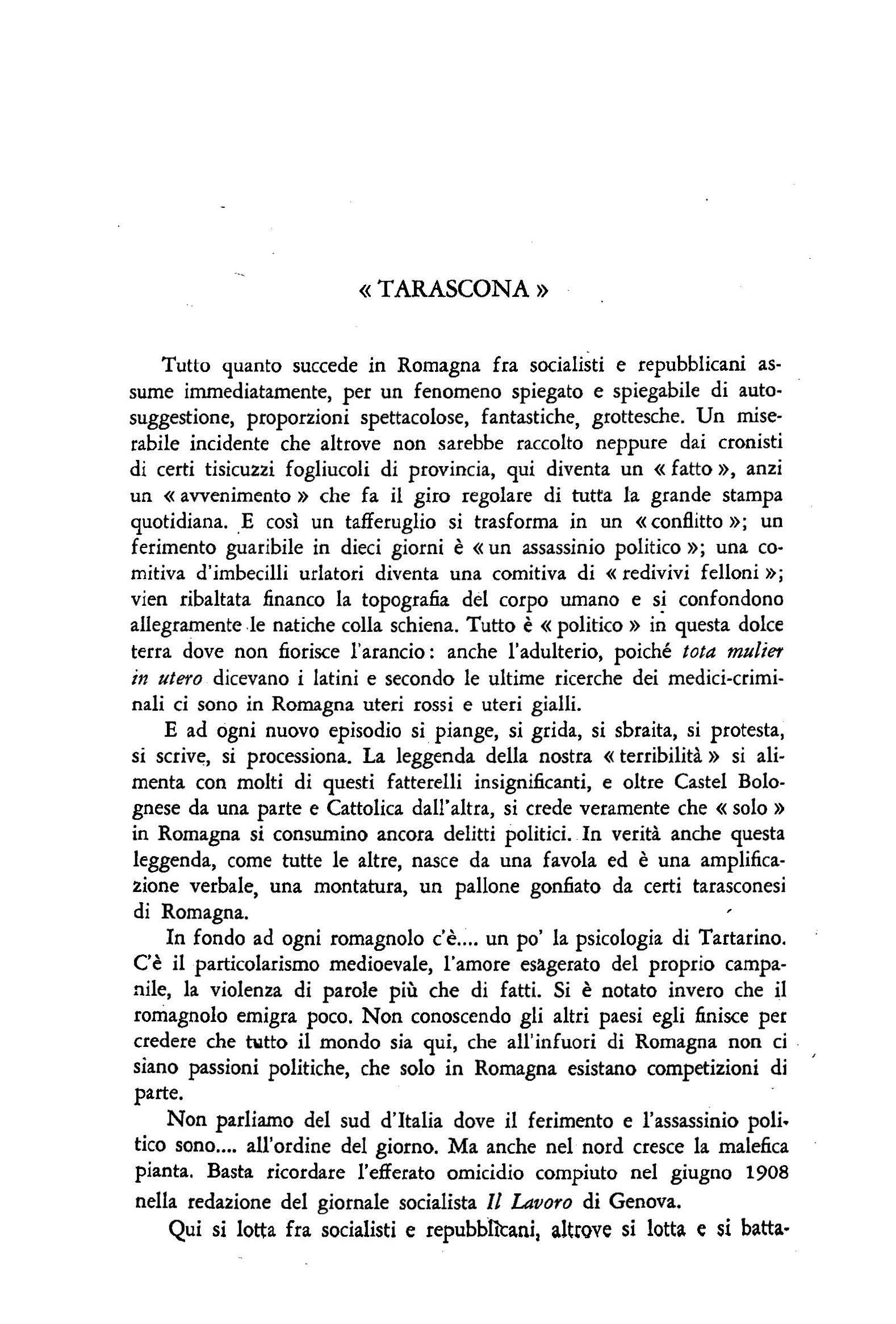 E ad Ogni nuovo episodio si piange, si grida, si sbraita, si protesta, si scrive, si processiona. La leggenda della nostra « terribilità » si alimenta con molti di questi fatterelli insignificanti, e oltre Castel Bolognese da una parte e Cattolica dall"altra, si crede veramente che «solo » in Romagna si conswnino ancora delitti politici. .In verità anche questa leggenda, come tutte le altre, nasce da una favola ed è una amplificazione verbale, una montatura, un pallone gonfiato da certi tarasconesi di Romagna.