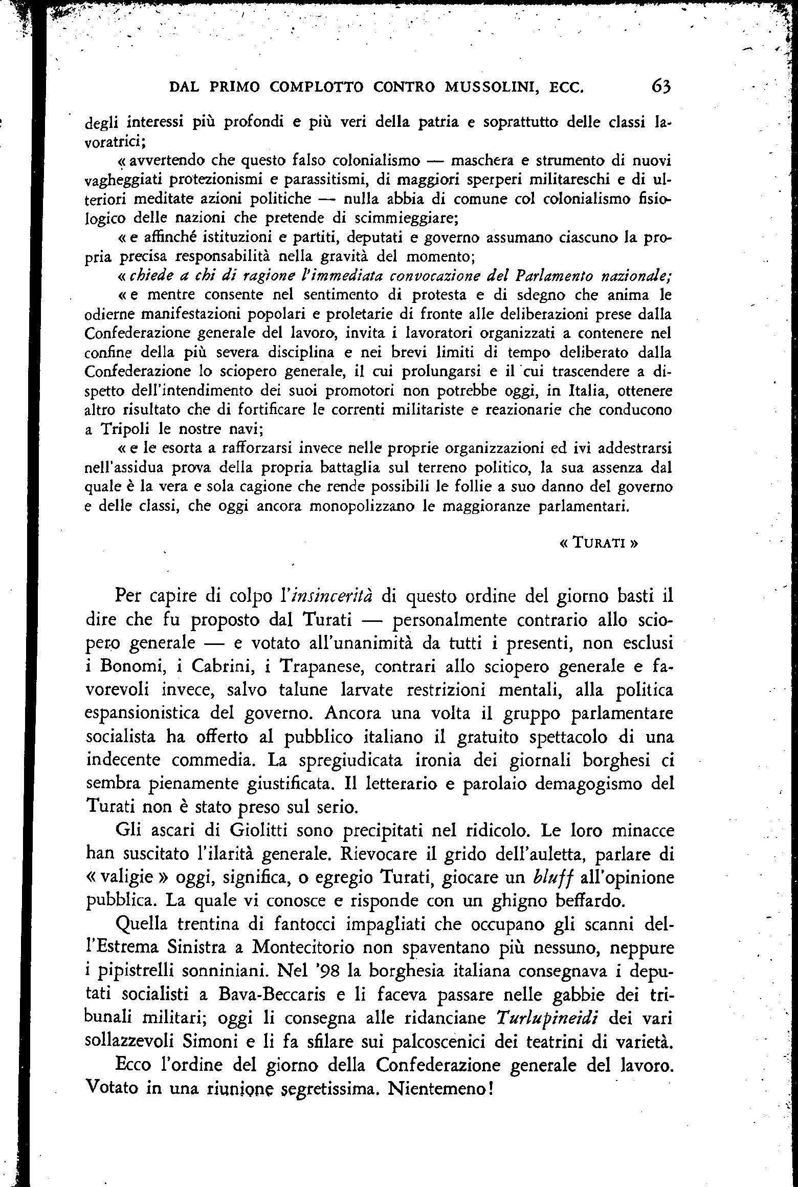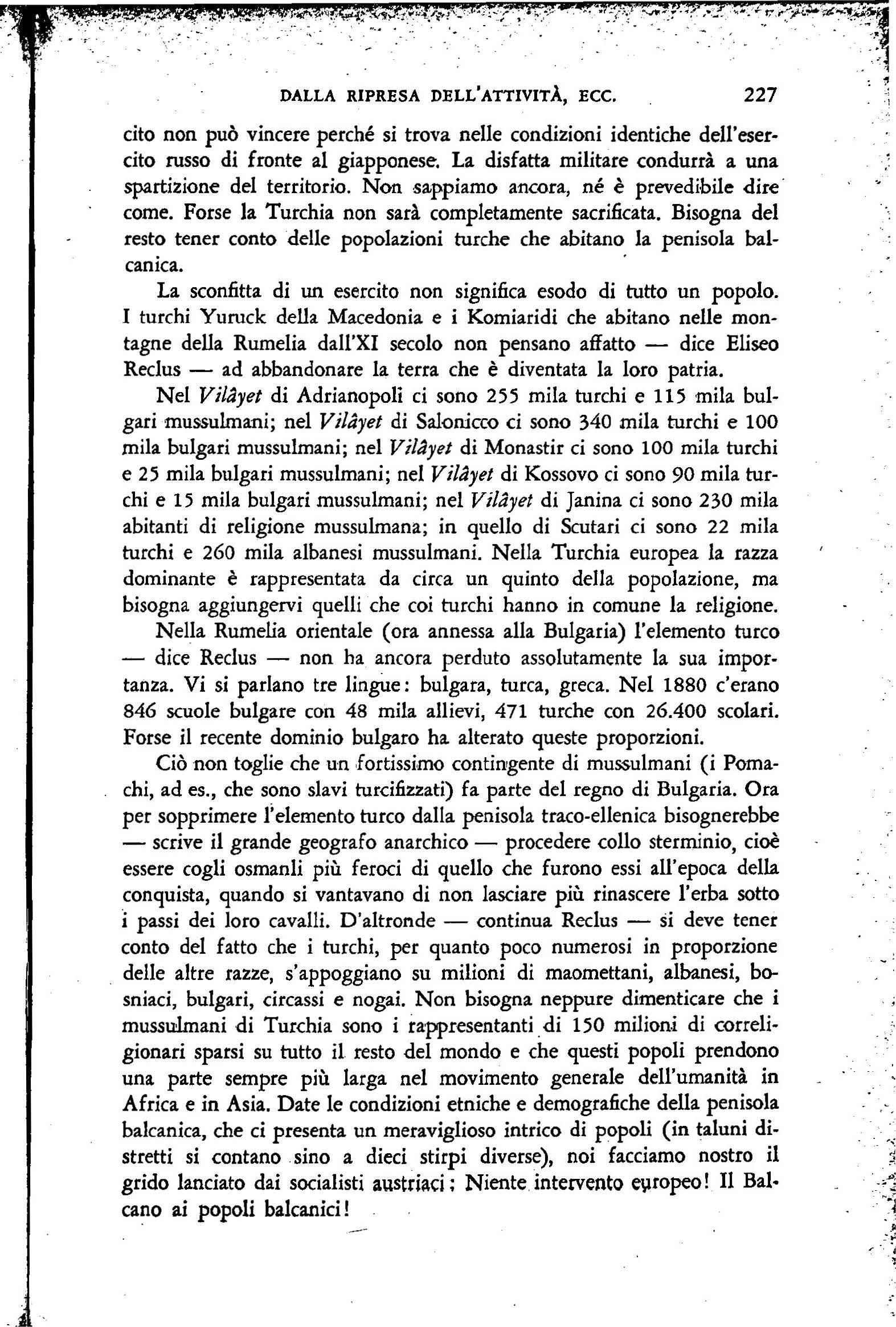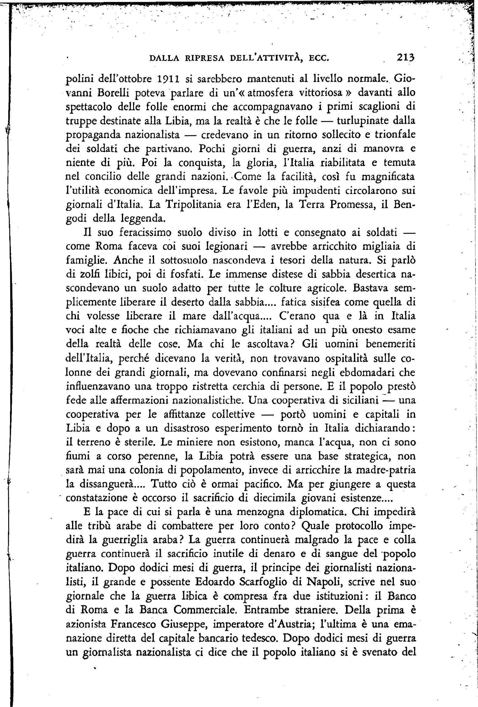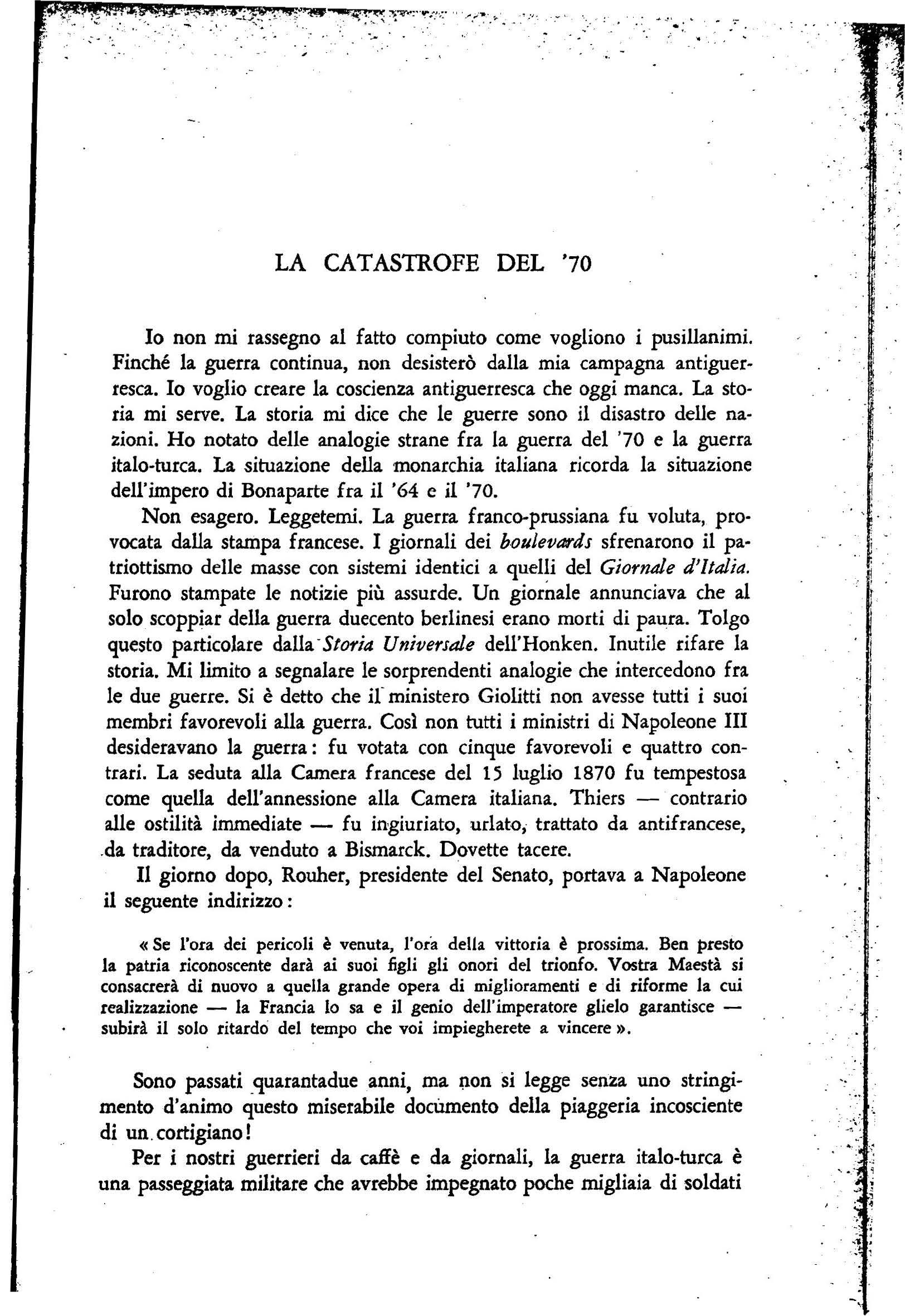 tanto che il 14 ottobre sarà arrestato Il 28 l'incaricato d'affari d'Italia a Costantinopoli' presenta al gran visir l'ultim~,;m dell'Italia a lla Turchia di accon· sentire" entro vcntiquattl'o orC' all 'occupazione italiana. in Tripolitania e Cirenaica (74). Il 29, avendo Ja Turchia r isposto al1'11ltima1um con ·una nota evasiva dilatoria, l'ItaJia dichiara lo stato di guerra contro la Turchia, Alla vigilia dell'arresto, Mus:mlini osserva che i clericali ed il Vaticano si sono alleati coi n12iondisti (7)); commt:nta una conferenza pronunciata a Forlì il 3 ottobre da libero Tancredi (77); partecipa 11.d un convegno federale delle sezioni socialiste forliv~i ( 265) e ad una. assemblea della sezione socialista di Porll (265).