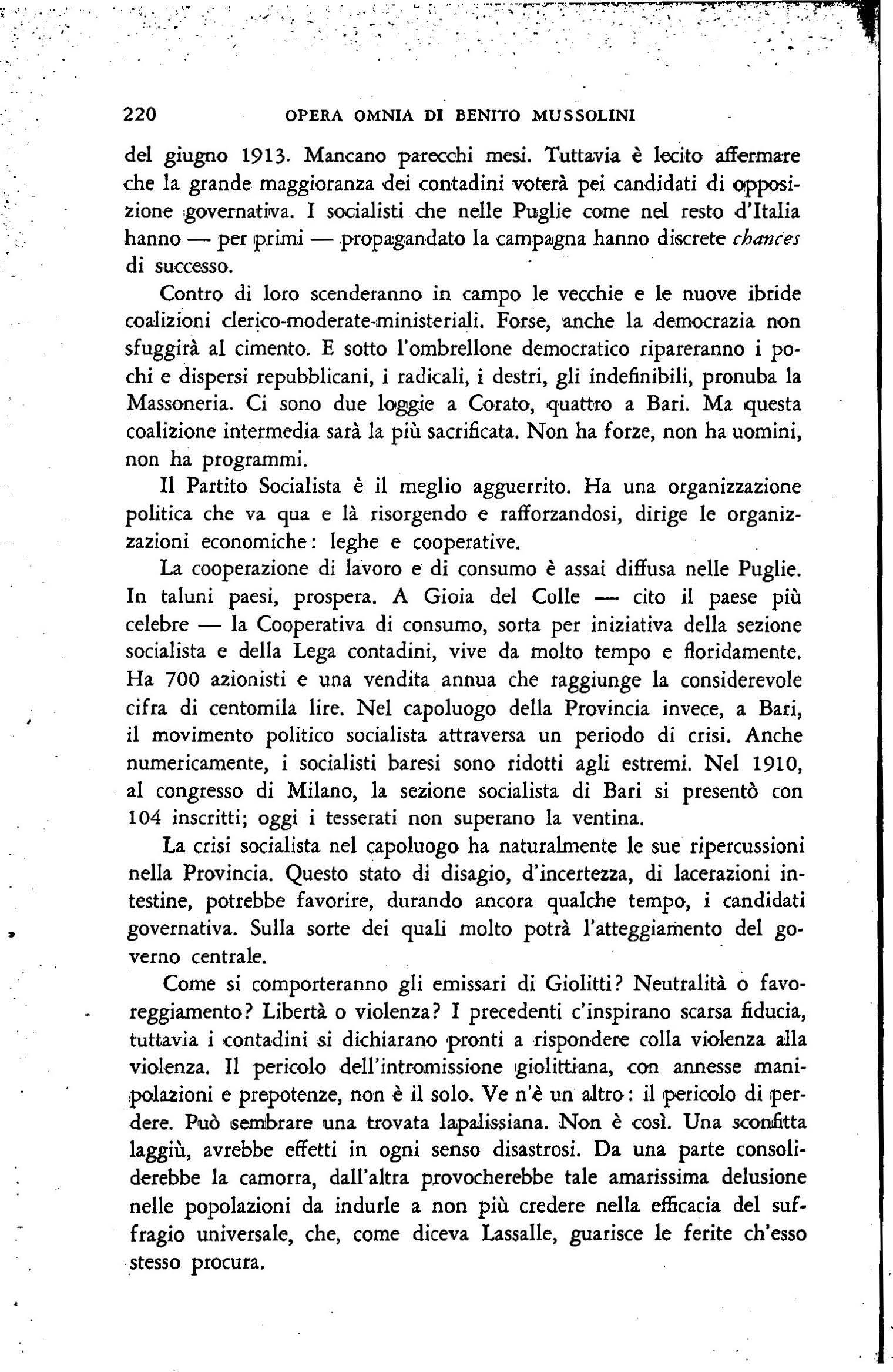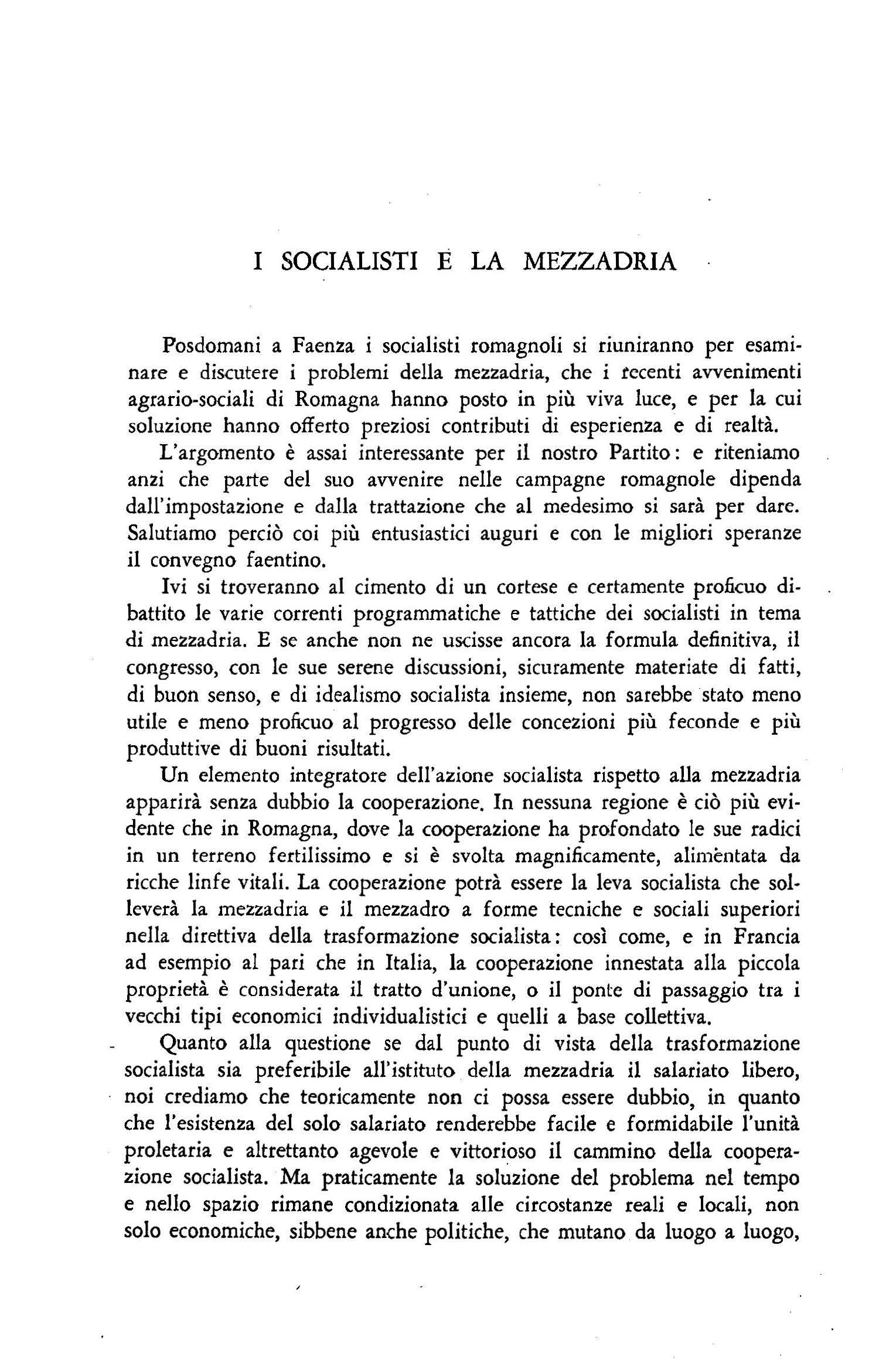 Un elemento integratore dell'azione socialista rispetto alla meuad ria apparirà senza dubbio la cooperazione. In nessuna regione è ciò più e vidente che in Romagna, dove la cooperazion e ha profondato le sue radici in un terreno fertiliss imo e si è svolta magnificamente, alimCntata da ricche linfe vita li La cooperazione potrà essere la leva soc ialista che sol· leverà la mez~adria e il mezzadro a fo rme tecniche e soc iali superiori nella direttiva della trasformazione socialista: così come, e in Francia ad esempio al pari che in Ital ia, l a cooperazione innestata alla piccola proprietà è con siderata il tratto d'unione, o il ponte di passaggio tra i vecchi tipi economici individualistici e quelli a base collettiva.