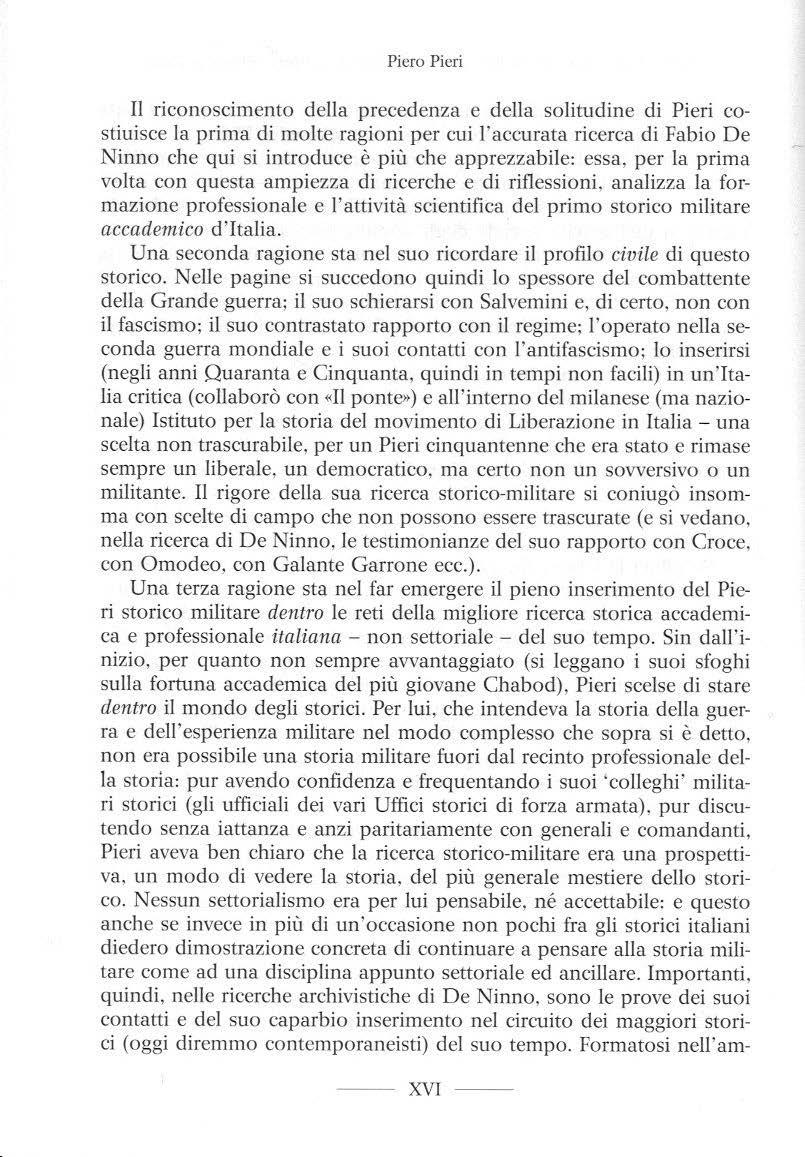 Il riconoscimento della precedenza e della solitudine di Pieri costiuisce la prima di molte ragioni per cui l'accurata ricerca di Fabio De Ninno che qui si introduce è più che apprezzabile: essa, per la prima volta con questa ampiezza di ricerche e di riflessioni, analizza la formazione professionale e l'attiv ità scientifica del primo storico militare accademico d'Italia .