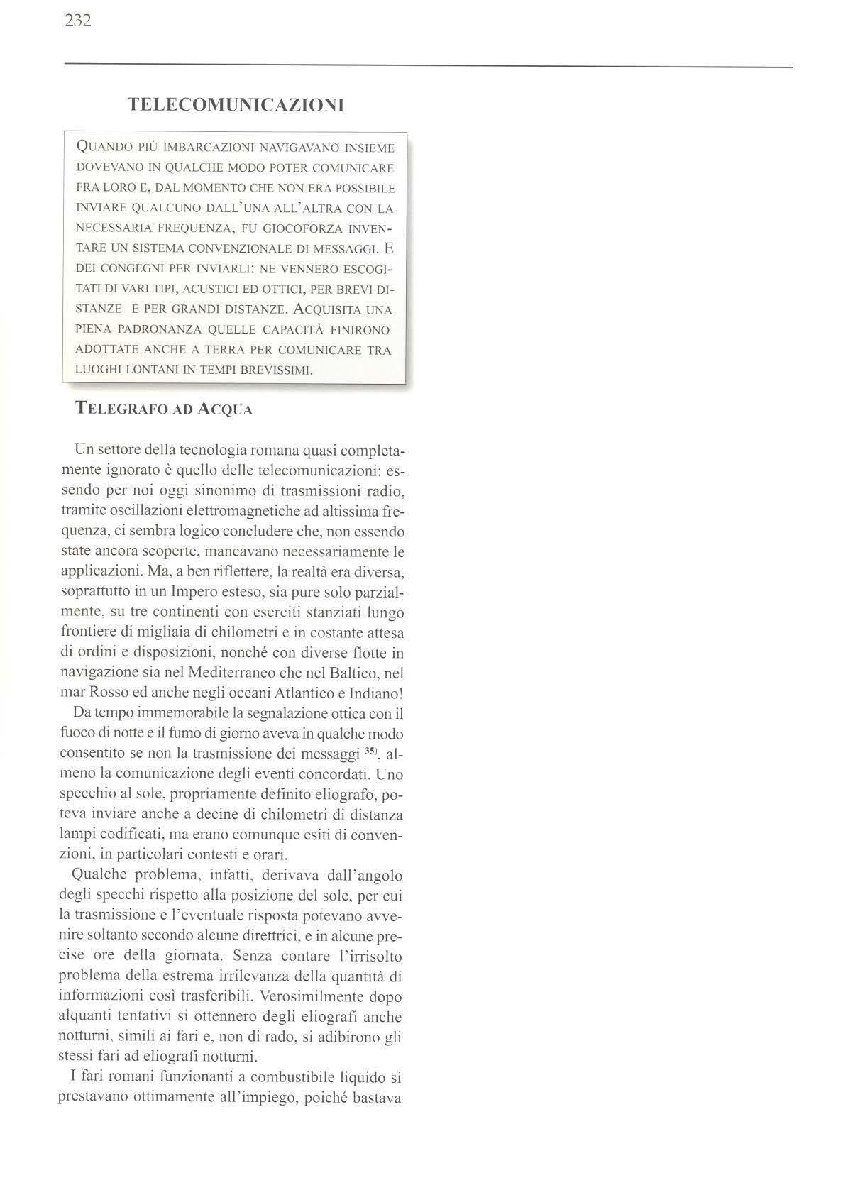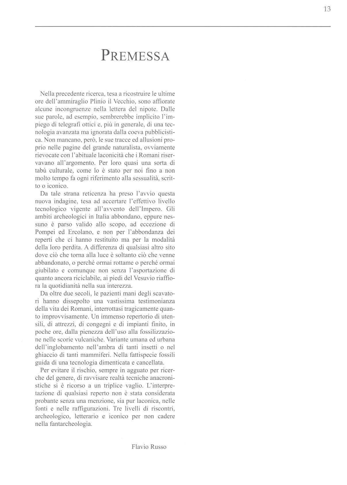 Nella precedente ricerca, tesa a ricostruire le ultime ore dell 'anuniraglio Plinio il Vecchio, sono affiorate alcune incongruenze nella lettera del nipote. Dalle sue parole, ad esempio , s embrerebbe implicito l"impicgo di telegrafi ottici e, più in generale, di una tecnologia avan z ata ma ignorata dalla coeva pubblici s tica. Non mancano, però, le s ue tracce ed allusioni proprio nelle pagine del grande naturalista, ovviamente rievocate con l'abituale laconicità che i Romani riservavano all'a rgomento. Per loro quasi una so1ia di tabù culturale, come lo è stato per noi fino a non molto tempo fa ogni riferimento alla sessualità , scritto o iconico.