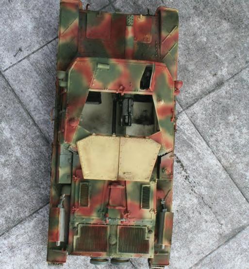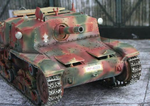 maglia in resina della Model Victoria. Le decals sono per tre esemplari usati dai tedeschi dopo l’armistizio e per il citato mezzo di “Montebello”; molto chiaro il foglio istruzioni che è pure abbastanza preciso nel descrivere gli schemi mimetici dei soggetti proposti dalle decals. Il prodotto Italeri può essere montato anche come da scatola avendo diversi pezzi per gli interni; risente però del fatto di essere impostato su un prodotto uscito molti decenni fa con alcuni errori nell’esattezza della riproduzione di particolari che oggi, grazie alla documentazione disponibile, possono essere corretti da chi vuol spingersi in un maggior dettaglio. L’assemblaggio non richiede particolari abilità; va usato pochissimo stucco, ad esempio sulla sovra struttura e in particolare nella delicata giunzione fra il pezzo raffigurante la piastra frontale e il gradino anteriore del semovente. Sull’esemplare italiano non va messa la leva caccia fango sulla ruota posteriore e le taniche esterne; visto il numero di targa sul retro del mezzo è da ritenersi più probabile la presenza dei due rulli di riserva e non della cassettina al posto di quello destro. La colorazione degli interni era per lo più in bianco opaco a eccezione degli sportelli d’accesso che erano verniciati con il giallo sabbia della mimetica esterna. All’inizio del 1943 in fabbrica veniva usato per i carri del R.E. un giallo sabbia ma, dopo essere arrivati nei reparti, sulle superfici esterne degli stessi mezzi venivano dipinte grandi e irregolari macchie di due colori, un verde e un marrone rossiccio che quasi non lasciavano più spazio al giallo di fondo. Per riprodurre questi colori ho usato smalti Humbrol 103 (sabbia) 149 (verde) e 107 (marrone) dati ad aerografo. Il semovente R.E. 6225 aveva stilizzato in bianco sulla destra della piastra frontale dell’armamento principale il simbolo reggimentale che ho ricavato dal foglio decals suppletivo RCR D01. La targa anteriore era dipinta mentre quella posteriore era in rilievo: per la prima basta usare solo la decalcomania offerta dal kit Italeri, per la targa posteriore ho usato la foto incisione dipinta di bianco cui poi ho applicato l’altra decal del kit. Dipinti le maglie di cingoli con un alluminio opaco, ho leggermente invecchiato il modello (il mezzo reale ha avuto una brevissima vita operativa) con terre di colorificio nere e marroni, senza ulteriori segni di usura.
