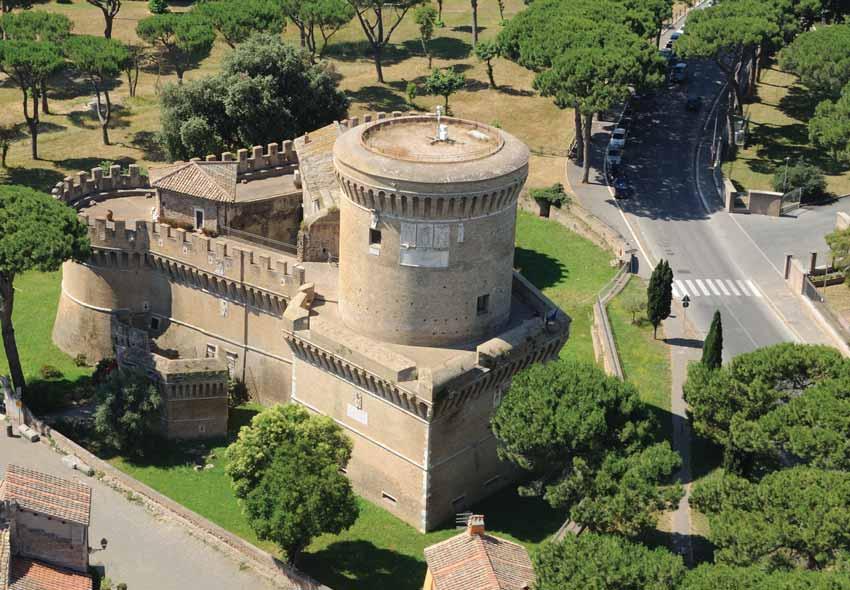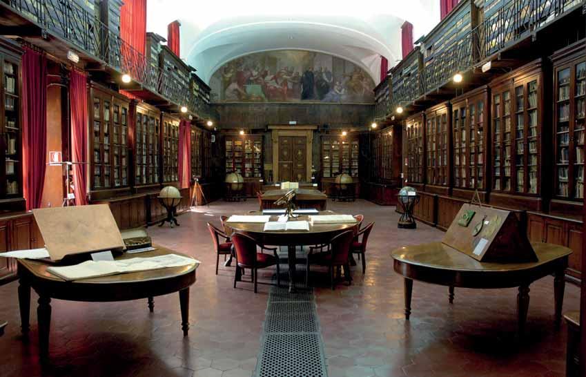 Sopra: Una sala del Museo. Militare. Il Salone affrescato della Biblioteca Attilio Mori.