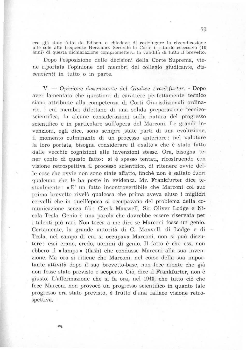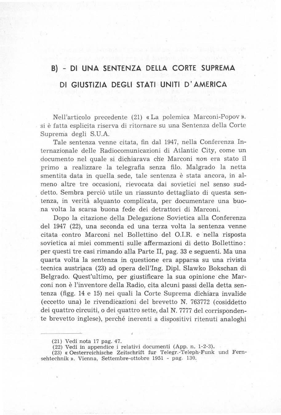 (5] - La frase è estratta da Radio Craft (?) de l 1939, non già da un documento ufficiale. La sentenza della Cor te Suprema degli Stati Uniti d el 1943, quale risulta dalle figg. 14 e 15, dice esattamente quanto i o ho scritto, cioè che Marconi è stato il pTimo a TealizzaTe, e non che egli è felicemente peTvenuto alla Tealizzazione (come dicono i miei contradditori) .