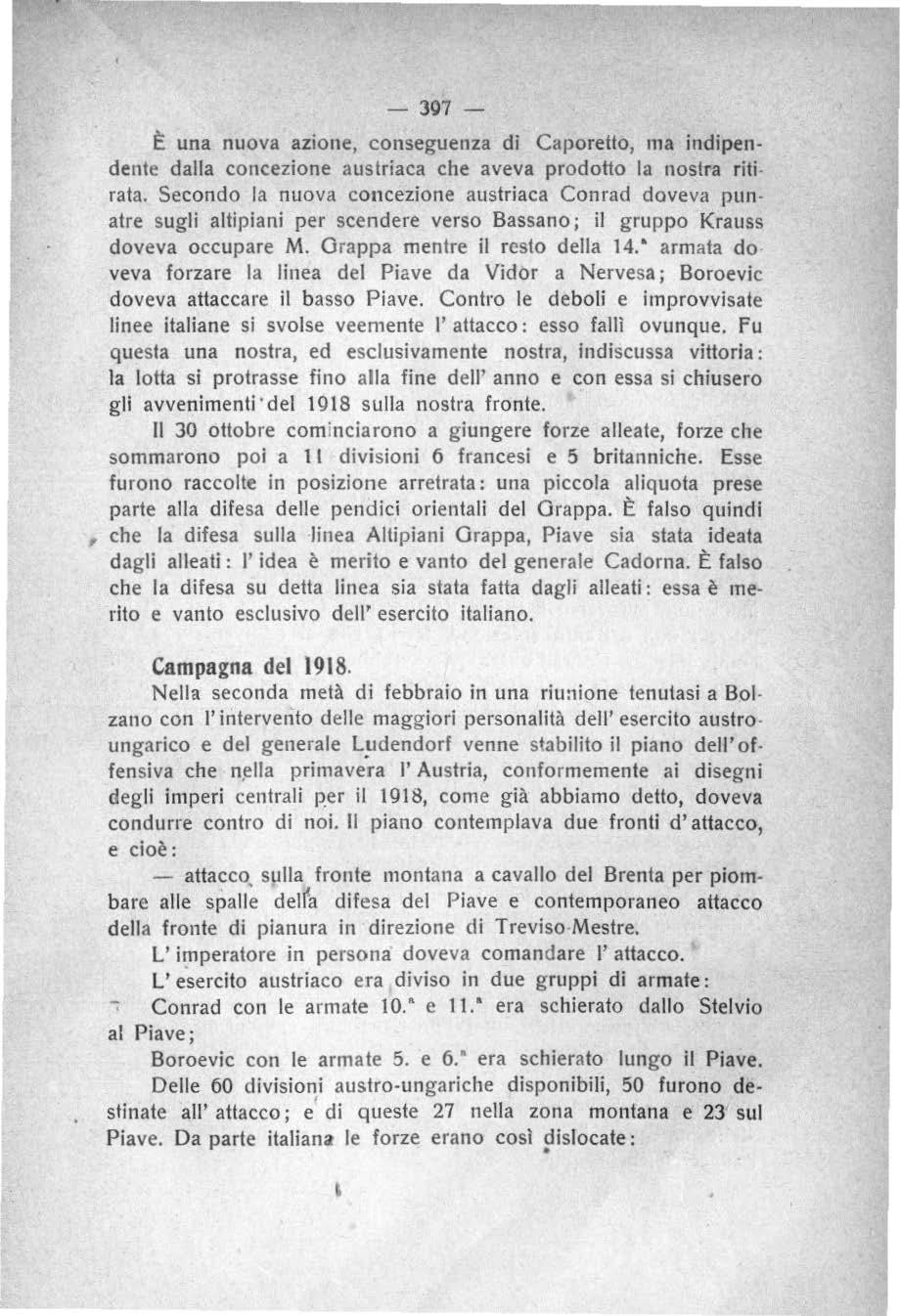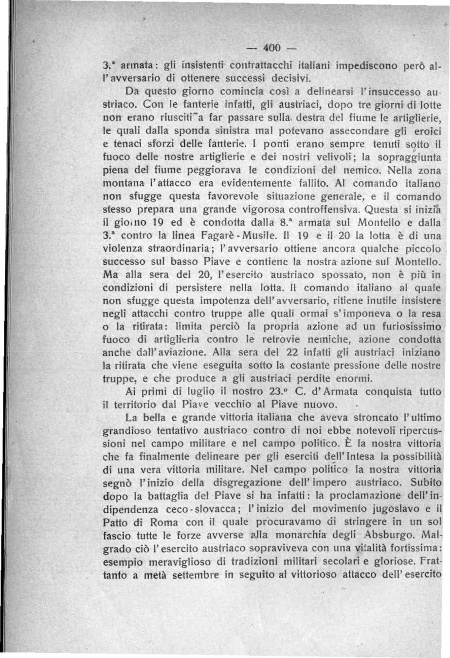 Il crollo della fronte del Grappa, e l'avanzata della 8.• armata verso la conca di Belluno, segnavano l'attuazio ne della no stra manovra: la separazione cioè dell'esercito austriaco in due ma sse: quella dei monti e quella ·del piano, masse impossibil itate a re carsi recip ro co appoggio.