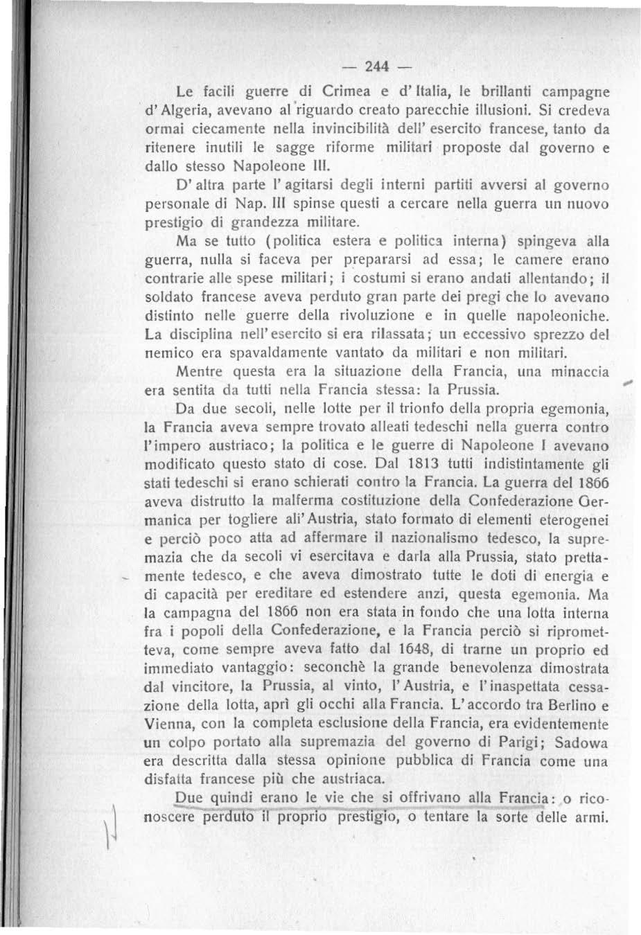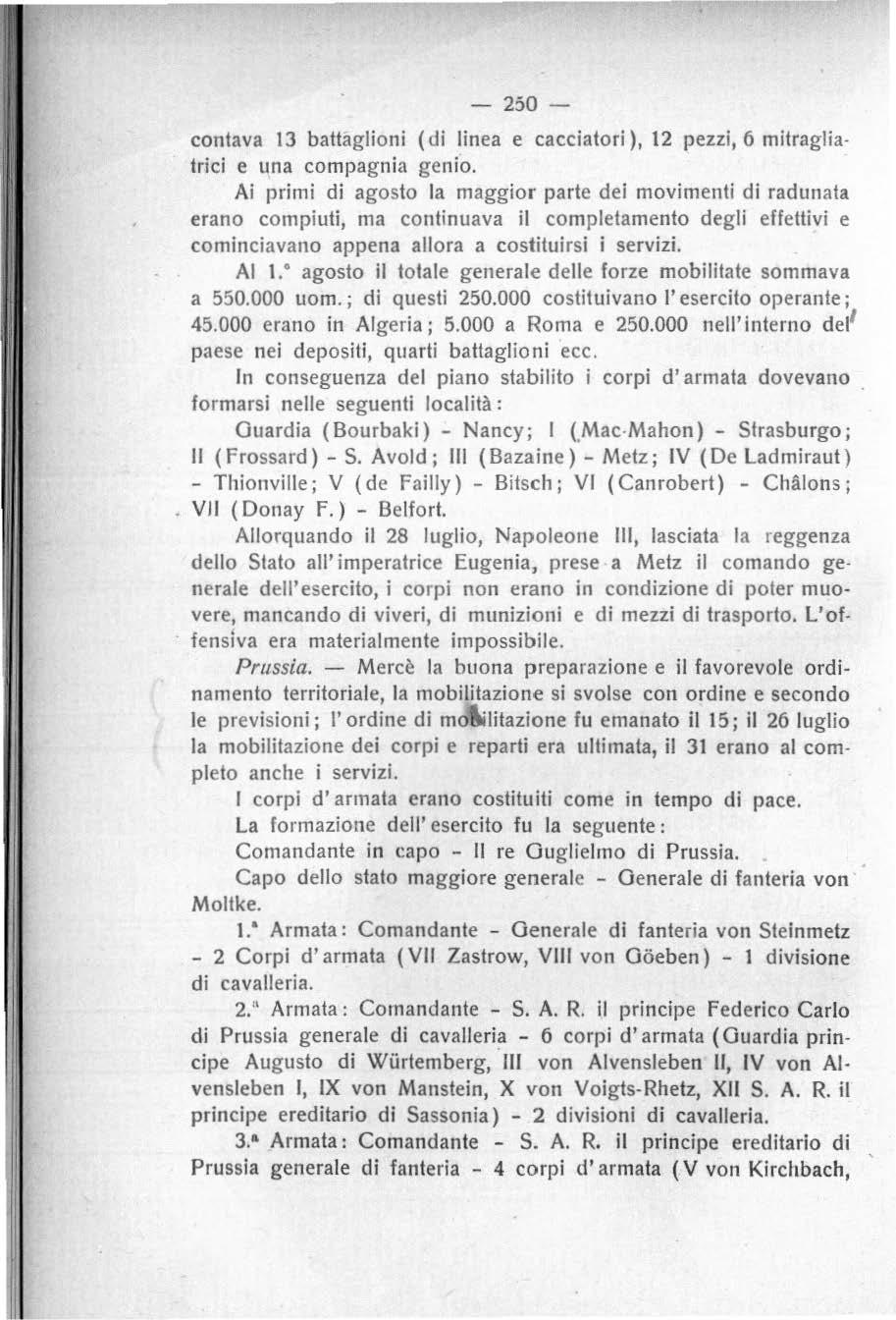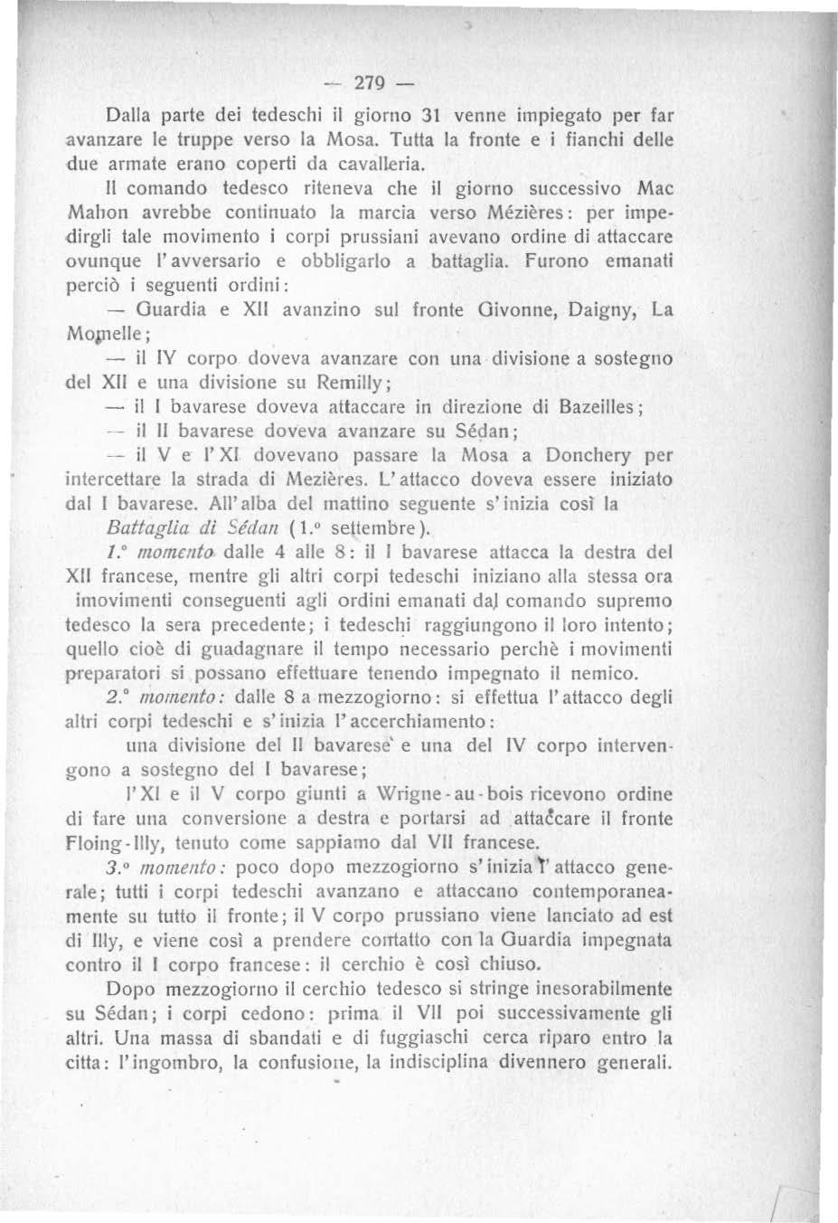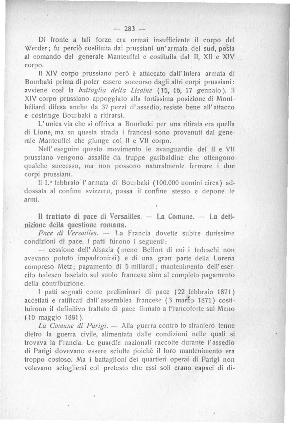 Il completamento dell'unità germanica attraverso la guerra franco prussiana del 1870· 71. - Le operazioni di questa dall'inizio fino all'investimento di Metz e quelle contro l'armata di Chàlons. - La resistenza francese dopo Sédan. - Il trattato di pace di Versailles. - La definizione della questione Romana. pag 243