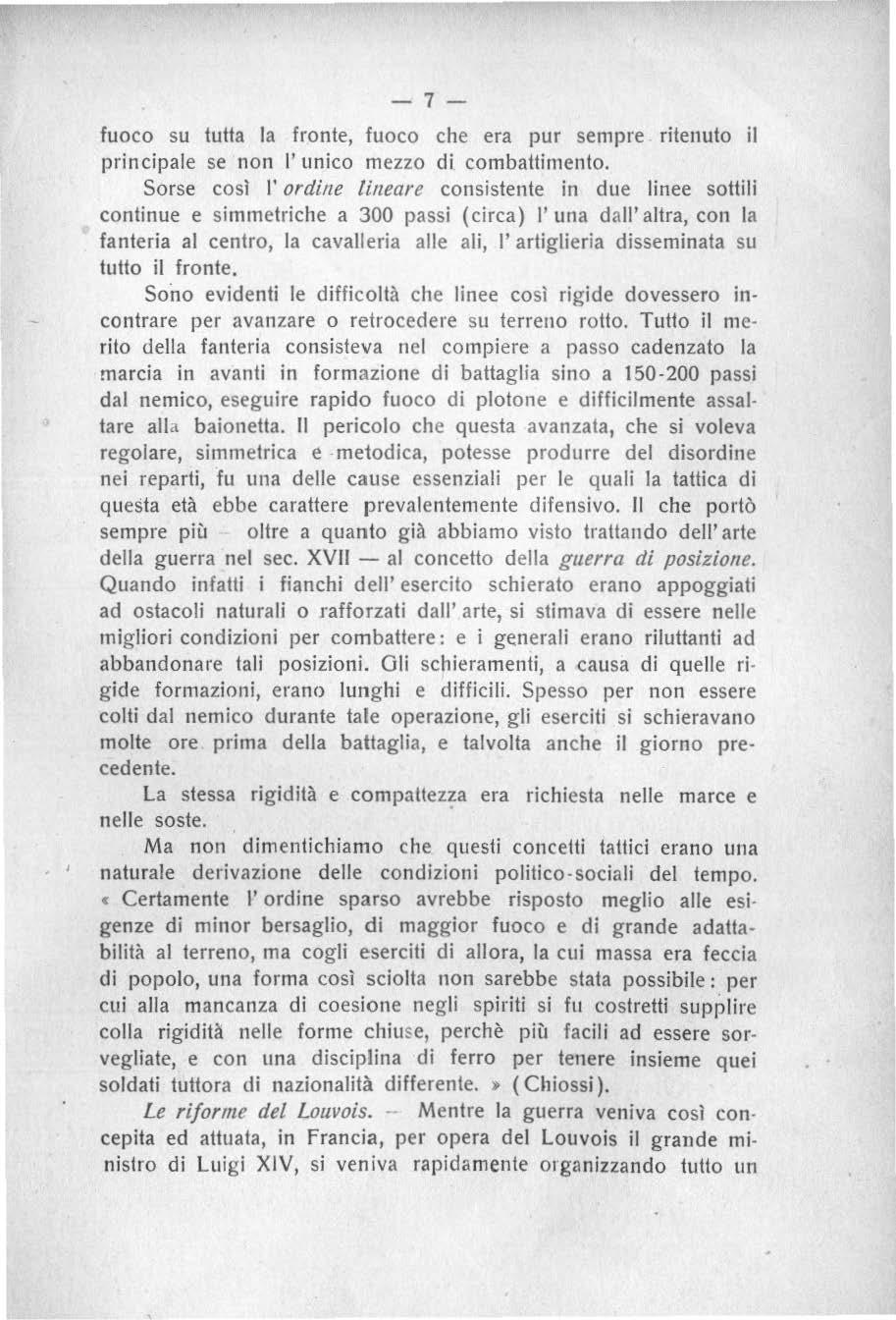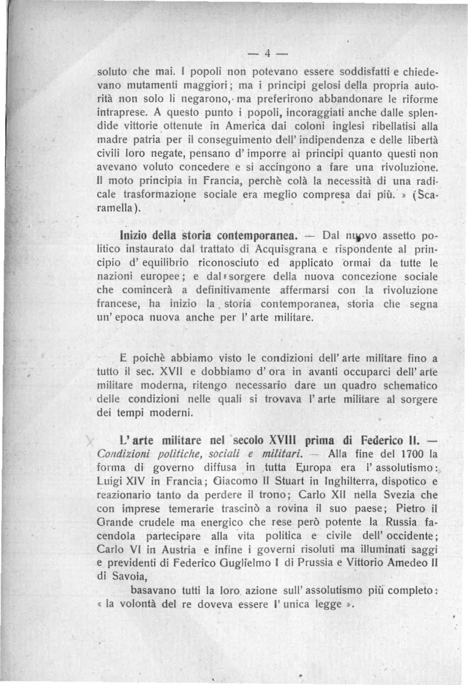 E poichè abbiamo visto le condizioni dell'arte militare fino a tutto il sec. XVII e dobbiamo d'ora in avanti occuparci dell'arte militare moderna, ritengo necessario dare un quadro schematico delle condizioni nelle quali si trovava l' arte militare al sorgere dei tempi moderni.
