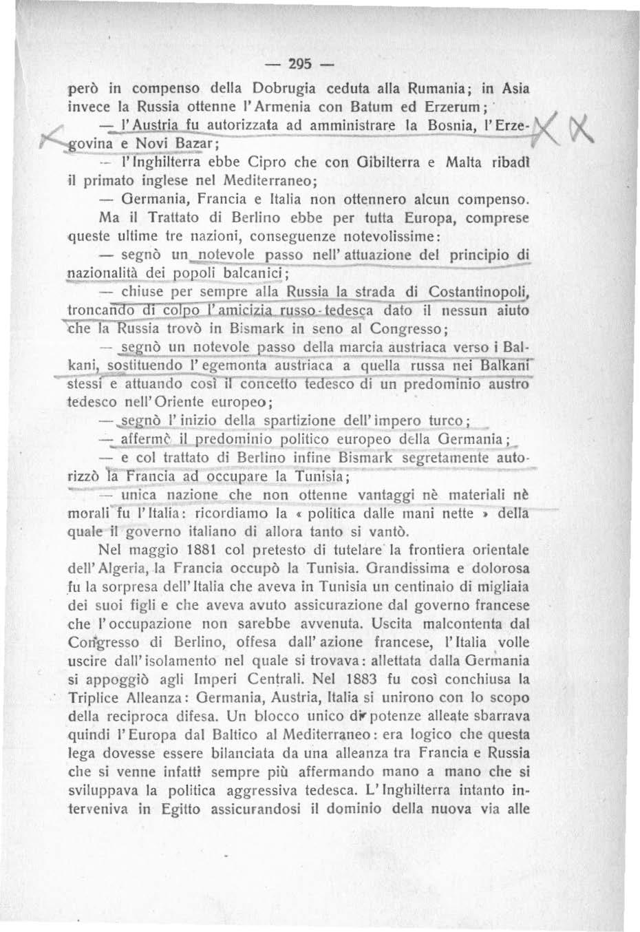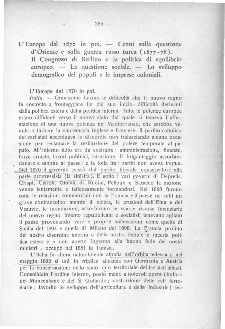 L'Europa dal 1870 in poi. - Cenni sulla questione d'oriente e sulla guerra russo turca ( 1877-78 ). Il Congresso di Berlino e la politica di equilibrio europeo. - La questione sociale. - lo sviluppo demografico dei popoli e le imprese coloniali