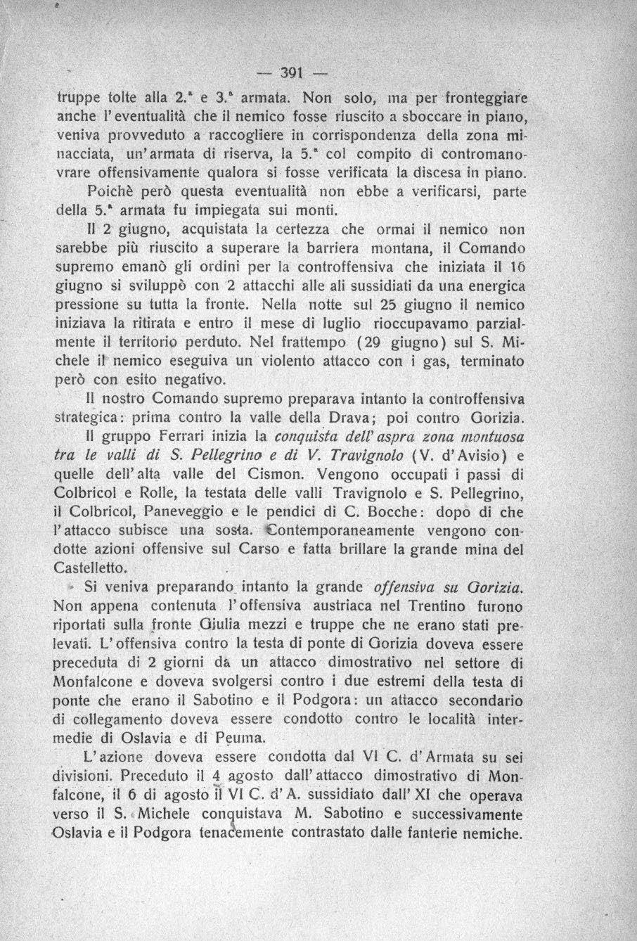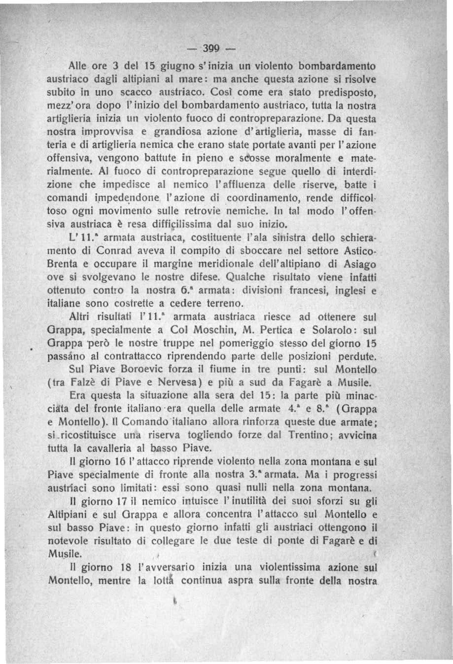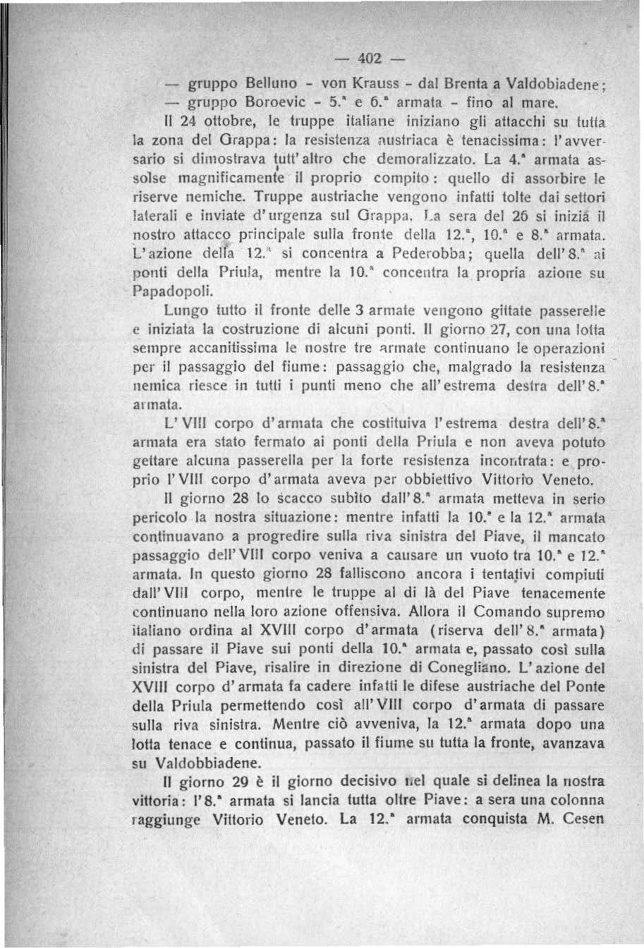 Il 31 si compiva la nostra manovra così come essa era stata concepita nel nostro piano d'operazione : la fronte del Grappa premuta di fronte e aggirata a sinistra, crollava: la nostra 4. • armata scendeva nel solco: fonzaso- feltre. L' 8. • armata vinta la resistenza nemica a lla s tretta di fad alto occupava Ponte nelle Alpi: Il corpo di cavalleria potèva entrare libe ramente in azione e si s pingeva al Tagliamento, mentre le armate 10: e 3: raggiungevano la Li venza. La nostra 6." armata attacca in direzione di Levico.