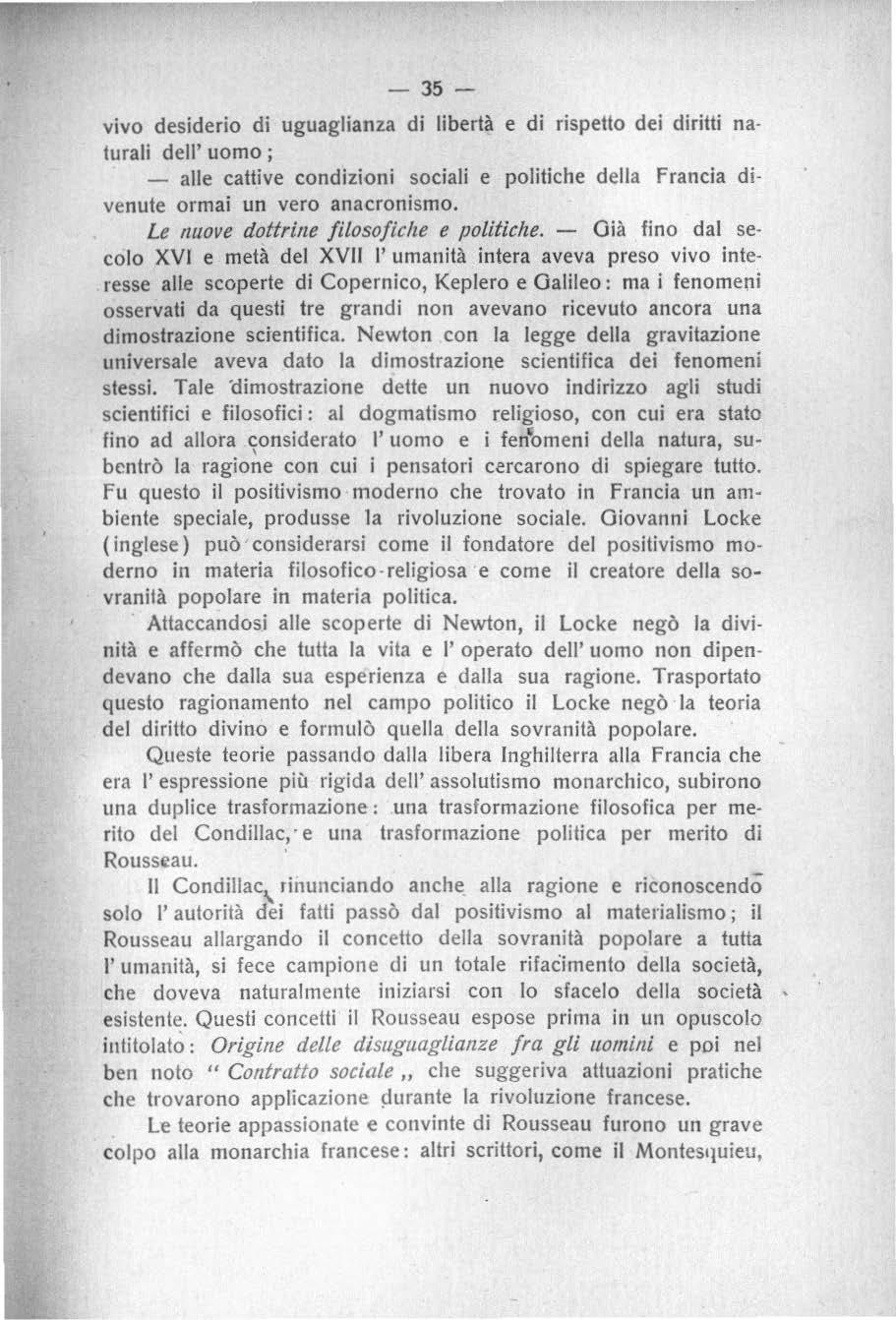 -4soluto che mai. r popoli non potevano essere sod disfatti e chiedevano mutamenti maggiori; ma i principi gelosi della propria autorità non solo li negarono,· ma preferirono abbandonare le riforme intraprese. A questo punto i popoli, incoraggiati anche dalle splendide vittorie_ ottenute in Ameriéa dai coloni inglesi ribellatisi alla madre patria per il conseguimento d ell' indipendenza e delle libertà civili loro negate, pensano d'imporre ai principi quanto questi non avevano voluto concedere e s i accingono a fare una rivoluziÒne. Il moto principia in Francia, perchè colà la nec essità di una radicale trasformazio,ne sociale era meglio compresa dai più. » ( Scaramella ).