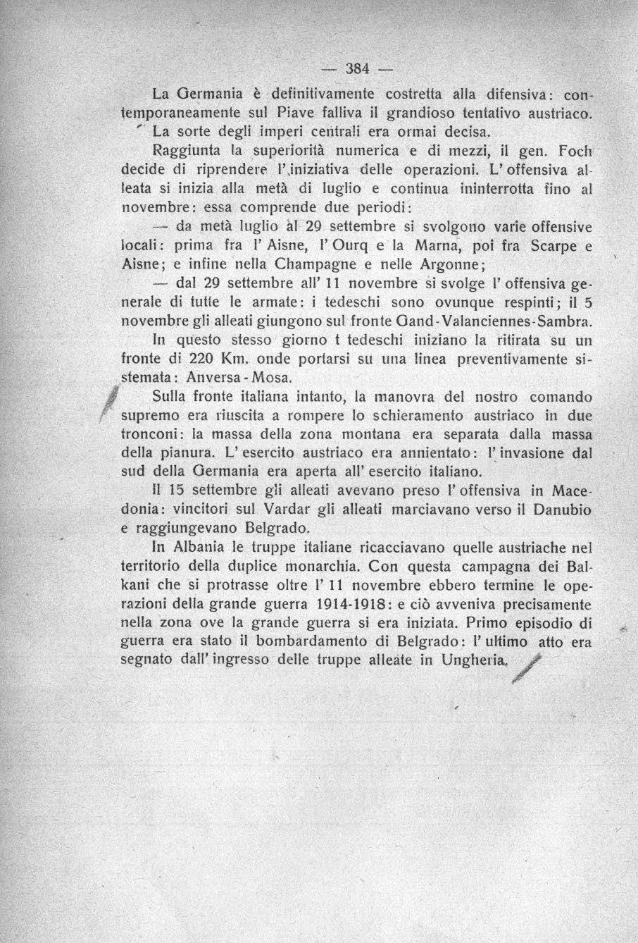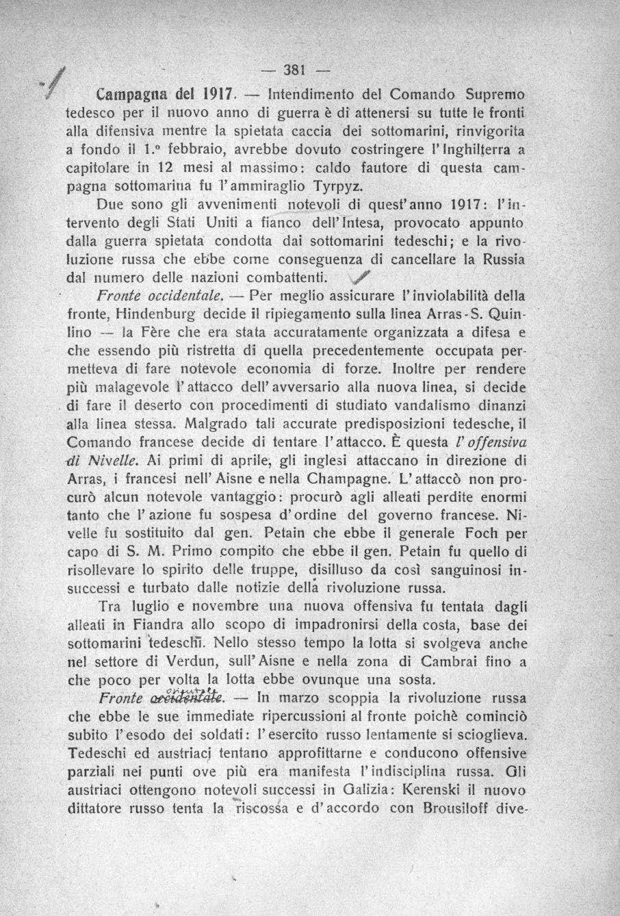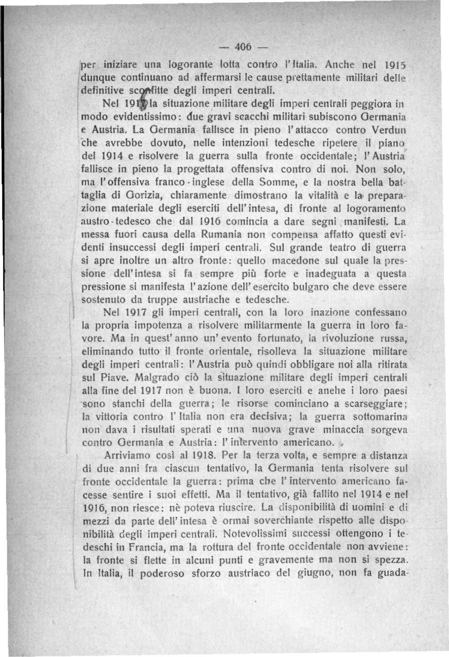 Nel 1917 gli imperi centrali, con la loro inazione confessano la propria impotenza a risolvere militarmente la guerra in loro favore. Ma in quest'anno un'evento fortunato, la rivoluzione russa, eliminando tutto il fronte orientale, risolleva la situazione militare degli imperi centrali: l'Austria può quindi obbligare noi alla ritirata sul Piave. Malgrado ciò la situazione militare degli imperi centrali alla fine del 1917 non è buona. I loro eserciti e anehe i loro paesi sono stanchi della guerra; le risors e cominciano a scarseggiare; la vittoria contro l' Italia non era decisiva; la guerra sottomarina non dava i risultati sperati e t1na nuova grave minaccia sorgeva contro Germania e Austria: l' intervento americano. , Arriviamo così al 1918. Per la terza volta, e sempre a distanza di due anni fra ciascun tentativo, la Germania tenta risolvere sul fronte occidentale la guerra: prima che l' intervento americano facesse sentire i suoi effetti. Ma il tentativo, già fallito nel 1914 e nel 1916, non riesce: nè poteva riuscire. La dispon ibilità di uomini e di mezzi da parte dell'intesa è ormai soverchiante rispetto alle dispo nibilità degli imperi centrali. Notevolissimi successi ottengono i tedeschi in Francia, ma la rottura del fronte occidentale non avviene: la fronte si flette in alcuni punti e gravemente ma non si spezza. In Italia, il poderoso sforzo austriaco del gi ugno, non fa guada-