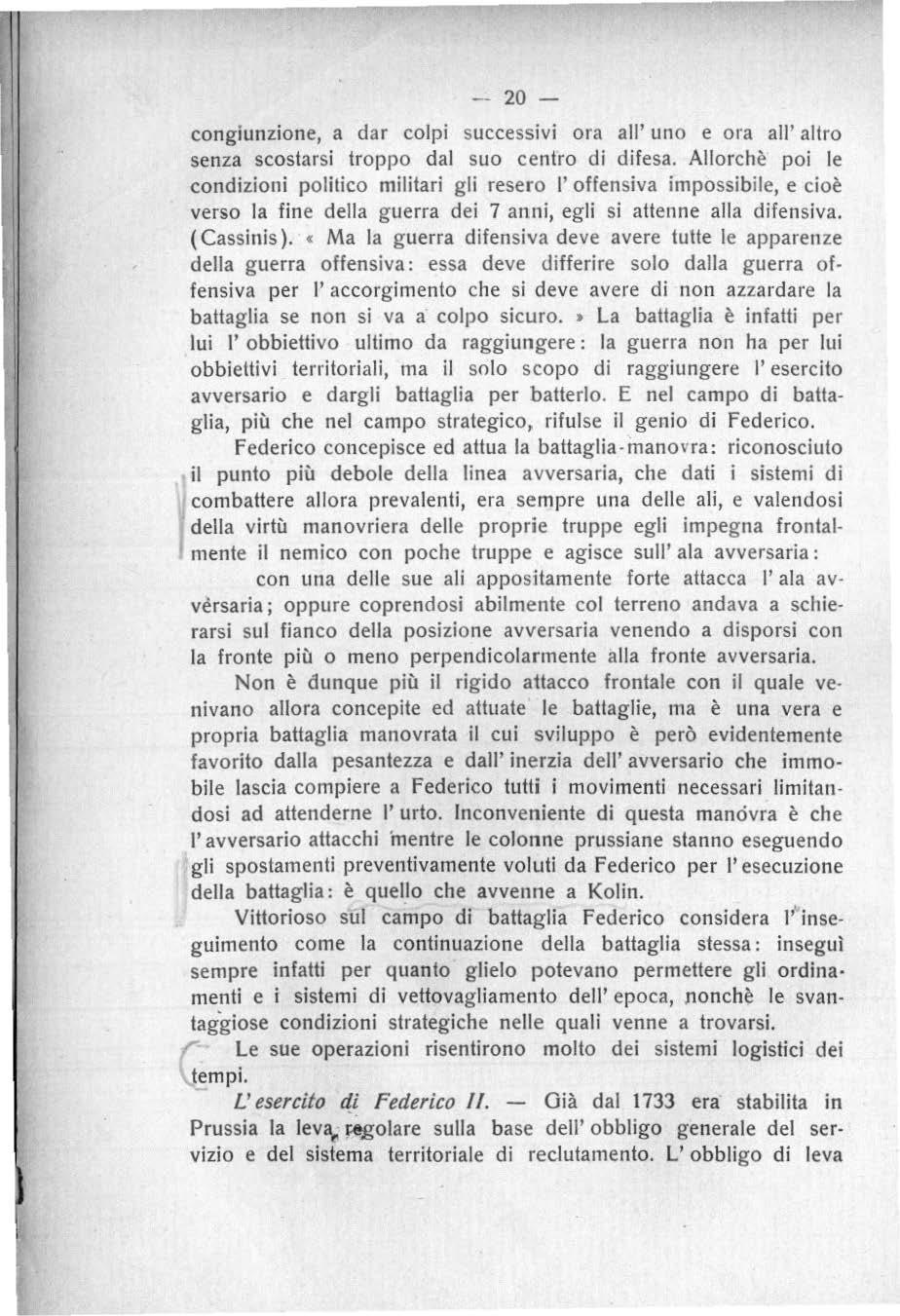 In queste guerre, i sovrani, che ben di radQ comandavan o effettivamente gli eserciti, pretesero ad o g ni modo, mediante l'a zione dei loro gabinetti militari di· dirigere le operazioni standosene tranquillamente nelle loro capitali, lontani dall' esercito. Contrariamente alle esigenze della guerra che richiederebbero nel condottiero pienezza di poteri, i generali di allora nulla potevano intraprendere senza prima chiederne la facoHà: la guerra era condotta unicamente dal monarca e pel monarca.