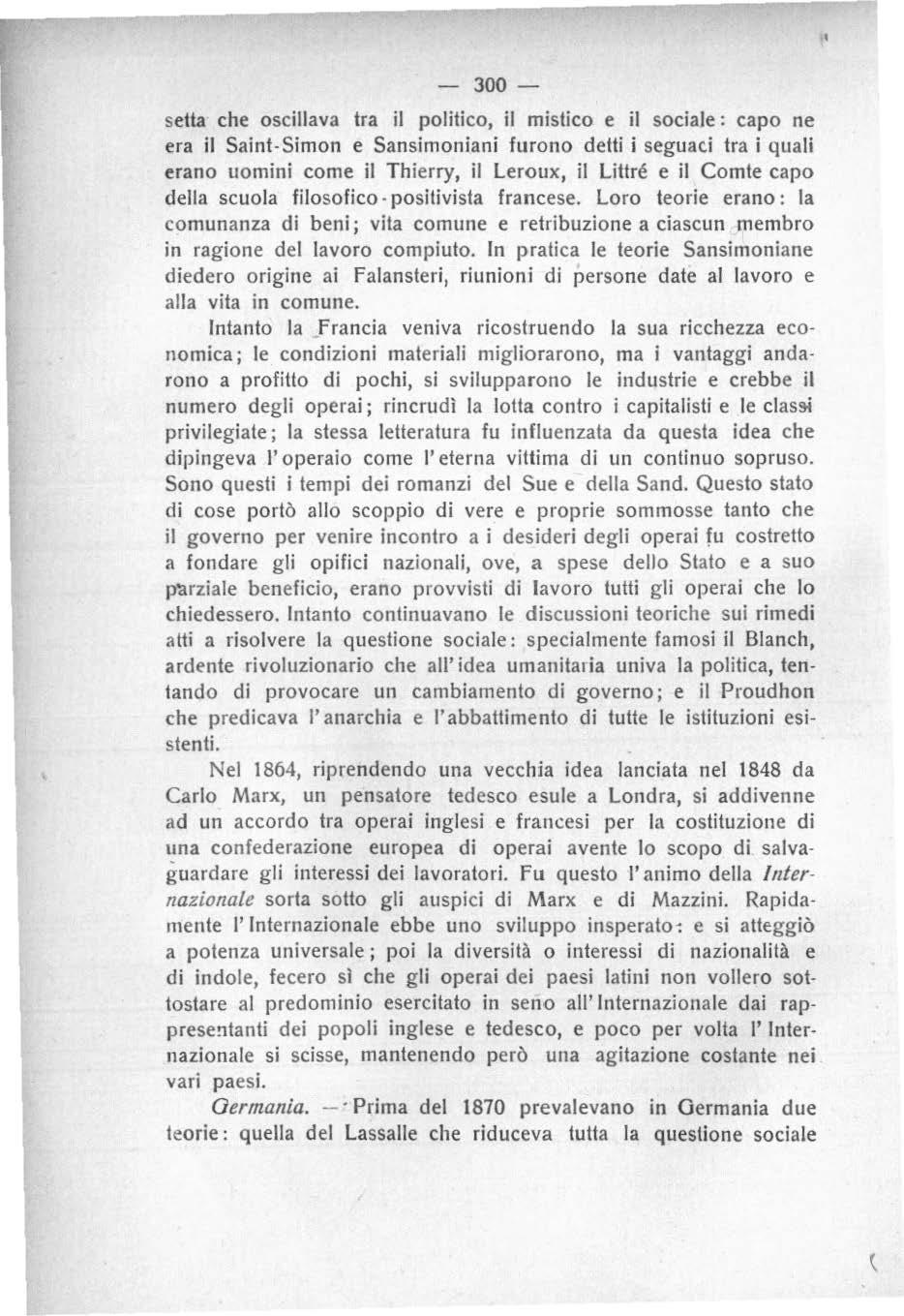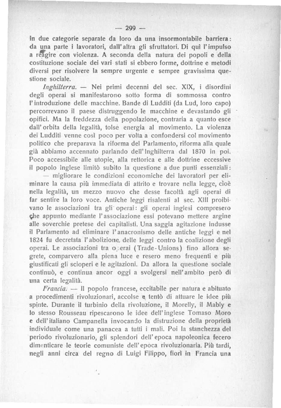 Condizioni sociali dell' Europa nella seconda metà del t 700. Ma intanto « un fiero malcontento sociale venne a manifestarsi in tutti i paesi d' Europa. A mala pena alcuni Stati avevano a caro prezzo conseguita libertà o politica o religiosa: ma la condizione della maggior parte dei popoli non differiva da quella dell' inizio 1 dell'evo moderno. Il ceto medio, la classe ormai più agiata e più intelligente, gemeva sotto l'assolutismo regio, reso più grave dal disordine dell'amministrazione dei paesi sottoposti ai Re; e insieme ai Re gravavano sulle classi non privilegiate i nobili, sottomessi al Monarca a patto di non perdere la loro autorità e i loro diritti sugli altri sudditi e di non contribuire alle spese dello Stato; e il clero, alleato dei troni purchè gli fosse lasciata la direzione delle coscienze. Era naturale che la borghesia non sopportasse di buon animo tale stato di cose, specialmente quando una numerosa schiera di scrittori d'ogni parte d' Europa lo dimostrò ingiusto e additò i rimedi consistenti nell' abolizione delle prerogative agli ordini privilegiati, nella partecipazione al governo del popolo affran cato dalla soggezione ai nobili e al clero. l principi stessi si resero conto del pericolo cui sarebbero andati incontro procedendo per la vecchia via, e molti di loro concessero riforme. Queste però riuscirono incomplete, perchè furono dirette a migliorare l' amministrazione interna degli Stati ma con utile più del monarca che dei sudditi, furono dirette ad infrenare le prerogative dei nobili e la· tendenza del clero ad immischiarsi nelle faccende civili, ma a vantaggio esclusivo del capo dello Stato che divenne così più as-
