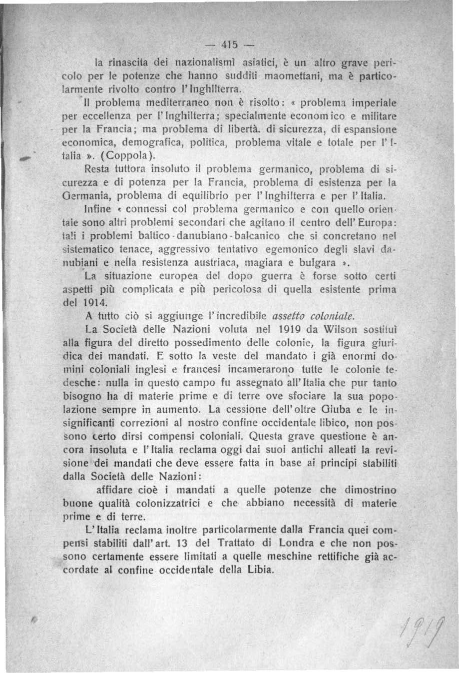 Il problema mediterraneo non è risolto: « problema imperiale per eccellenza per l'Inghilterra; specialmente economico e militare per la Fran cia; ma problema di libertà. di sicurezza, di espansione economica, demografica, politica, problema vitale e totale per l' Italia ». (Coppola).