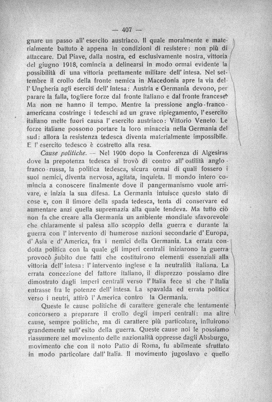 Queste le cause politiche di carattere generale che lentamente concorsero a prepara re il crollo degli imperi centrali: ma altre cause, sempre politiche, ma di carattere pitl particolare, influirono grandemente sull'esito della guerra. Queste cause noi le possiamo riassu mere nel movimento delle nazionalità oppresse dagli Absburgo, movimento che con il noto Patto di Roma, fu abilmente sfruttato in modo particolare dall'Italia. Il movimento jugoslavo e quello