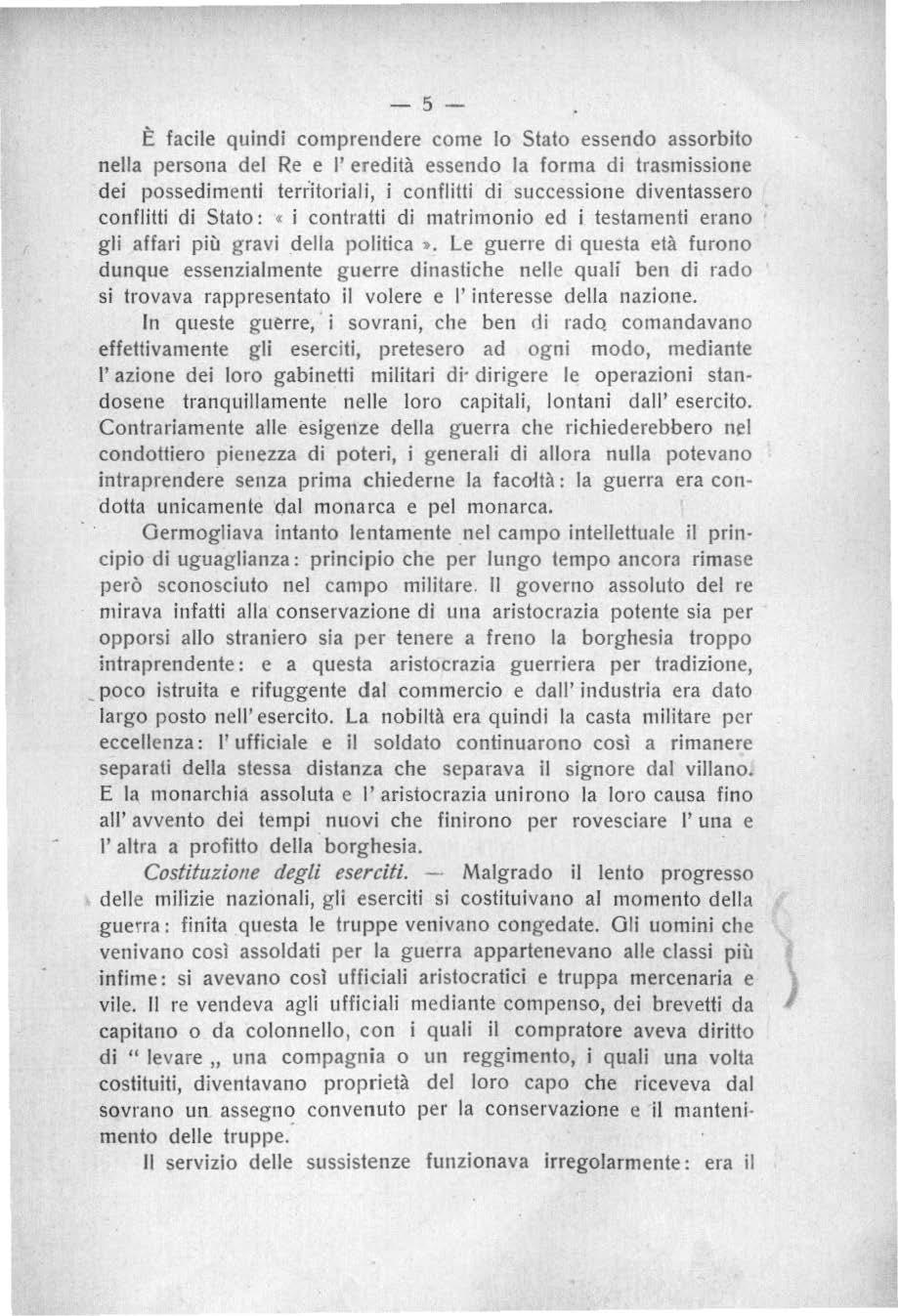È facile quindi comprendere come lo Stato essendo assorbito nella persona del Re e l' eredità essendo la forma di trasmissione dei possedimenti territoriali, i conflitti di successione diventassero conflitti di Stato: « i contratti di matrimonio ed i testamenti erano gli affari più gravi della politica » . Le guerre di questa età furono dunque essenzialmente guerre dinastiche nell e quali ben di rad o si trovava rappresentato il volere e l' interesse della nazione.