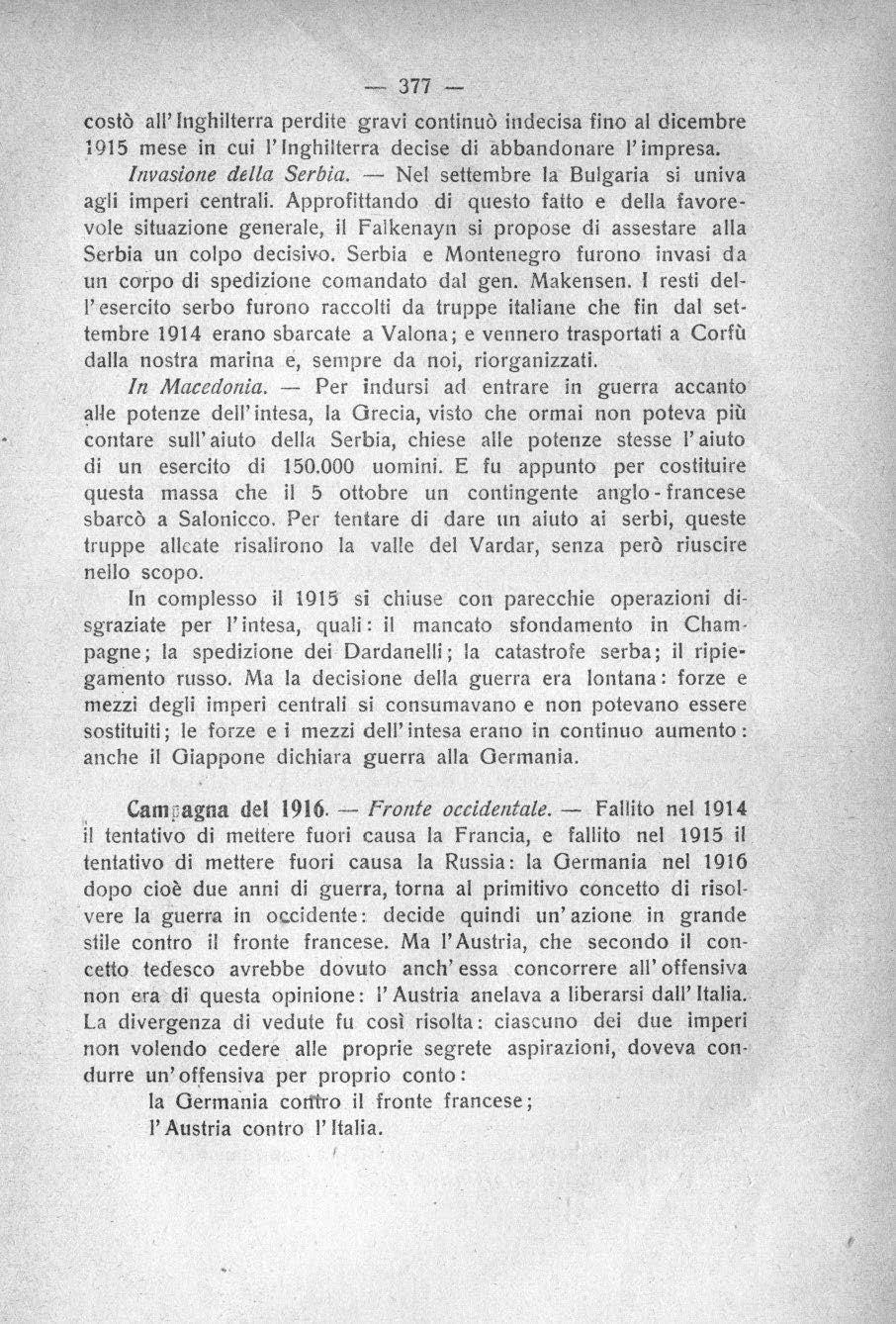 Nel 191Jia situazione militare degli imperi centrali peggiora in modo evidentissimo: due gravi scacchi militari subiscono Germania e Austria. La Germania fallisce in pieno l'attacco contro Verdun che avrebbe dovuto, nelle intenzioni tedesche ripetere il piano del 1914 e risolvere la guerra sulla fronte occidentale; l'Austria fallisce in pieno la progettata offensiva contro di noi. Non solo, ma l'offensiva franco· inglese della Somme, e la nostra bella ba ttaglia di Gorizia, chiaramente dimostrano la vitalità e la preparazione ma te ri ale degli eserciti dell'intesa, di fronte al logoramento austro- tedesco che dal 1916 comincia a dare segni manifesti. La messa fuori causa della Rumania non compensa affatto questi evidenti insuccessi degli imperi centrali. Sul grande teatro di guerra si apre inoltre un altro fronte: quello macedone sul quale la pressione dell'intesa si fa se mpre più forte e inadeguata a questa pression e si manifesta l'azione dell'esercito bul garo che deve essere sostenuto da truppe austriache e tedesche.