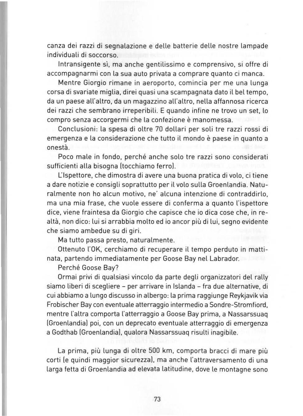 Altra preoccupazione che ci assilla è l'approvvigio namento di tutto il materiale d'emergenza, per la sopravvivenza in mare e in zone artiche, così come prescritto dalle autorità canadesi per autorizzarci il sorvolo del Labrador, dello Stretto di Baffin e dell'isola della Groenlandia .