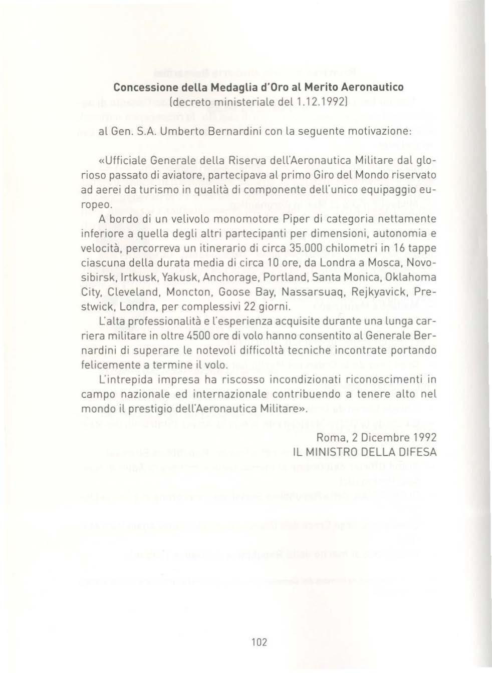 «Ufficiale Generale della Riserva dell"Aeronautica Militare dal glorioso passato di av iatore. partecipava al primo Giro del Mondo riservato ad aerei da turismo in qualità di componente dell"unico equipaggio europeo.