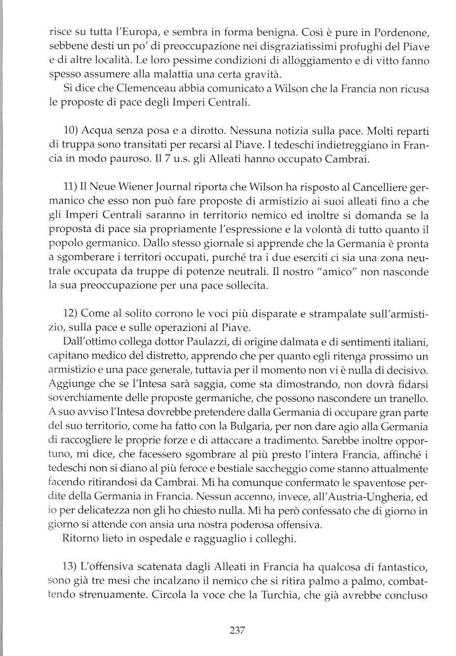 Intan to, dinanzi a i s u oi occhi di prigioniero che è tutta v ia avido d'informarsi, scorre la gra nde s to ri a : i bo lscevichi, la Rivo l uzione d'ottobre, l'assassi nio de ll a fam iglia imperiale russa, la rivoluzione k ema l is ta turca (i "soldati di Maometto" appena in t ra v isti), l'epidemia di spagnola . Anc he in c iò, questa fonte è preziosa per il s u o carat tere d i " presa diretta": e le riserve det ta te dalle prudenziali ques tioni di metodo storico non possono che esse re mo l to rela tive .