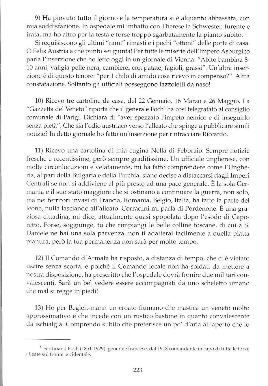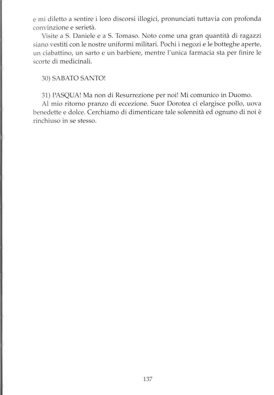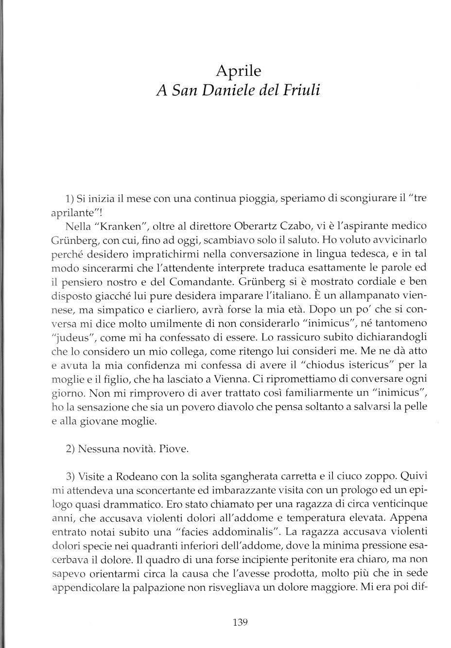 Come trovasi annotato alla fine di ques to Diario, a liberazione avvenuta1, fui co mandato a d isimpegnare il servizio sanitario in Pordenone e nelle località limitrofe. Avvenne che un giorno il portiere dell'Ospedale civile mi comunicò che, men tre ero fuori della città, il Cav. Enzo Chiaradia di Caneva aveva chiesto di me per essere informato circa il decorso della malattia di un suo conoscente che io avevo in cura. Non m i fu da to di conosce rlo perché ritornò al proprio paese.