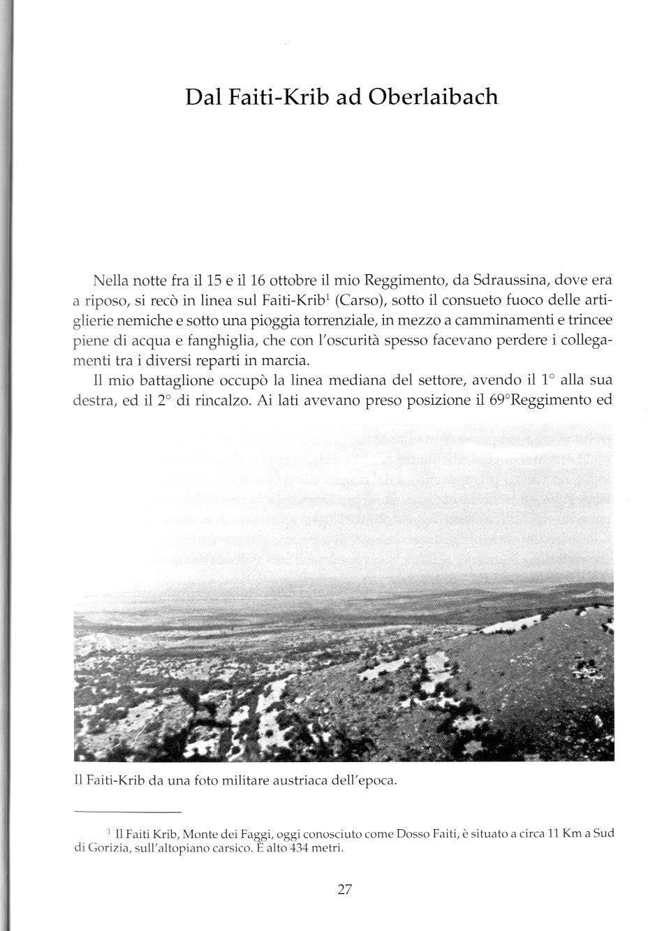 Nella notte fr a il 15 e il 16 ottobre il mio Reggimento, da Sdraussina, dove era a riposo, s i recò in linea sul Faiti - Krib 1 (Carso), sotto il consue to fuoco delle artiglierie nemic he e sotto una pioggia torrenziale, in mezzo a camminamenti e trincee piene di acqua e fanghiglia, che con l'oscurità s pesso facevano perdere i collegamenti tra i diversi repa rti in marcia.