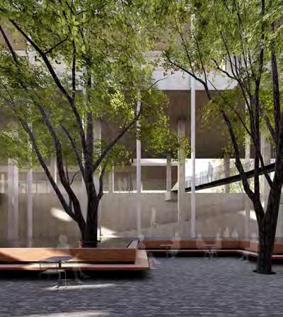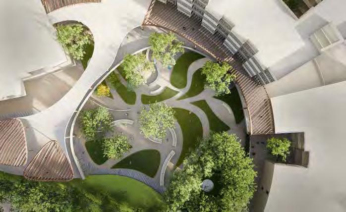 The design thoughtfully responds to its two distinct surroundings by incorporating two landscaped areas: one that is more publicfacing, engaging directly with the adjacent school, and another that offers a relatively more private, tranquil space near the recreation center.
