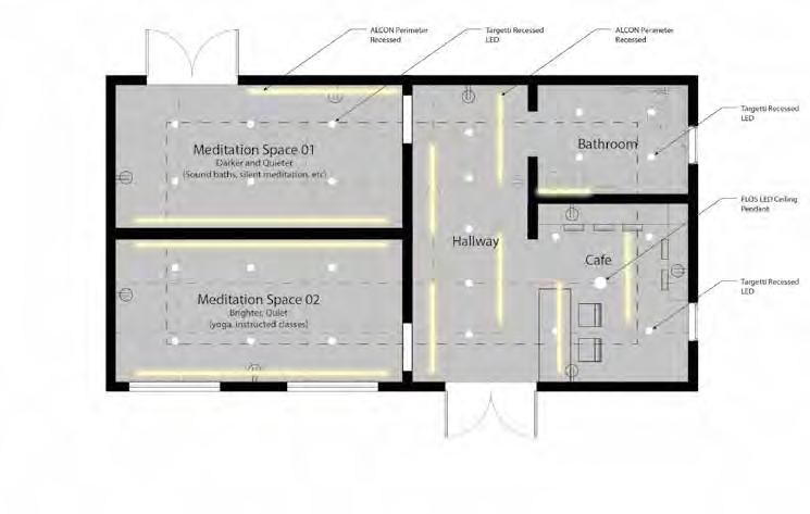 Two distinct meditation spaces are positioned across the cafe, separated by a wall and hallway. The first meditation space is located adjacent to the existing window conditions to make the best use of natural light for instructional activities such as yoga. The second meditation room is situated closer to the back, ensuring further separation from auditory distractions. It incorporates a variety of design features, including cove lighting situated close to the floor and ceiling baffles, creating a dark meditation space that minimizes interference from external noise and light.