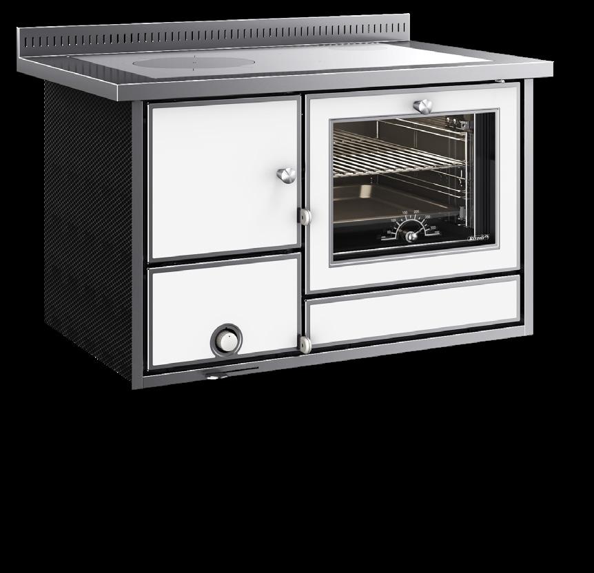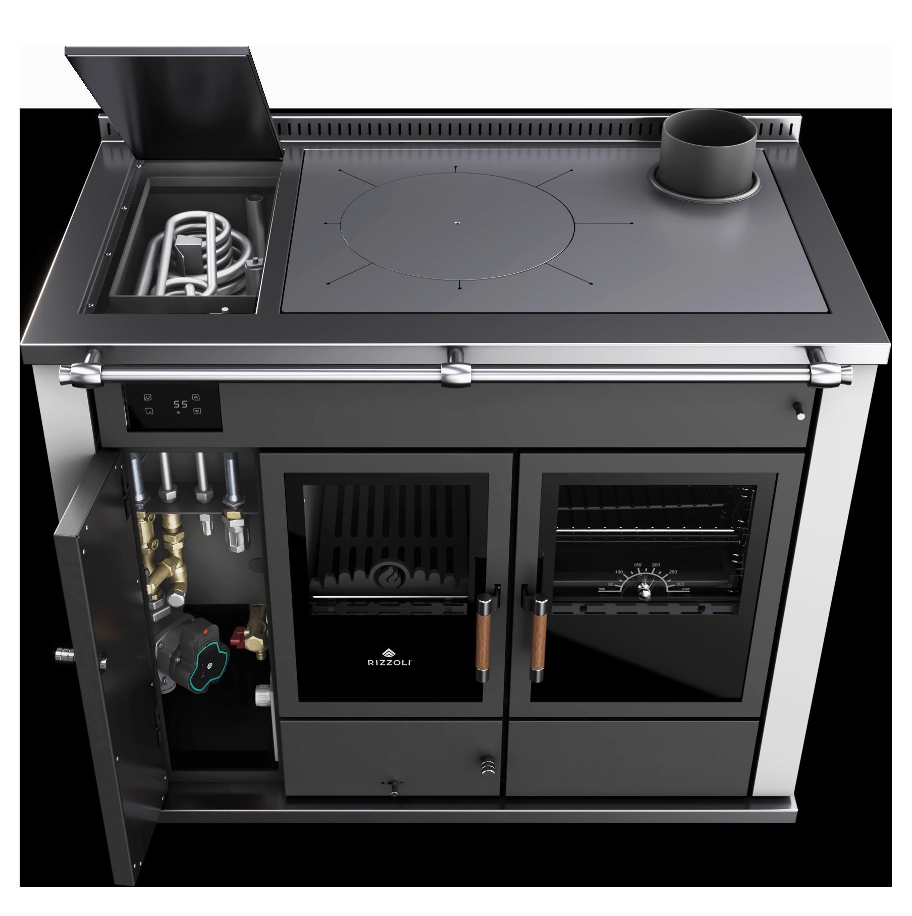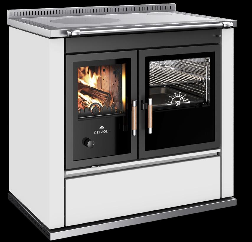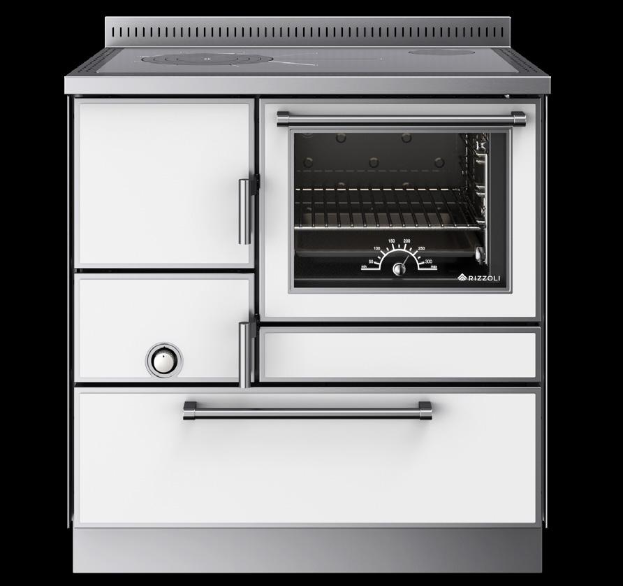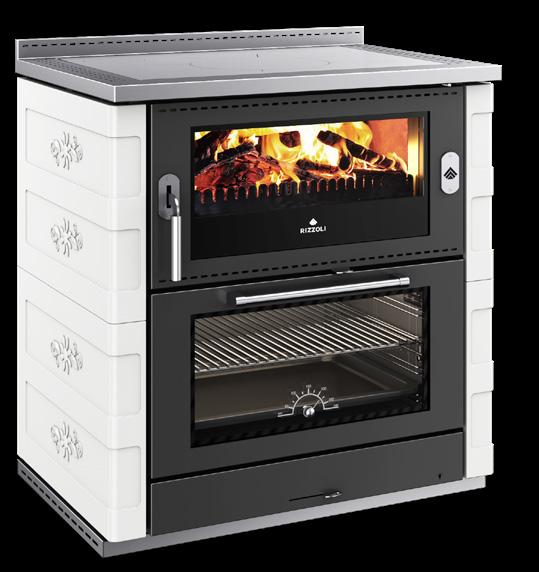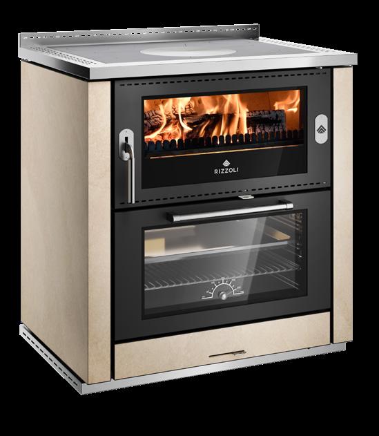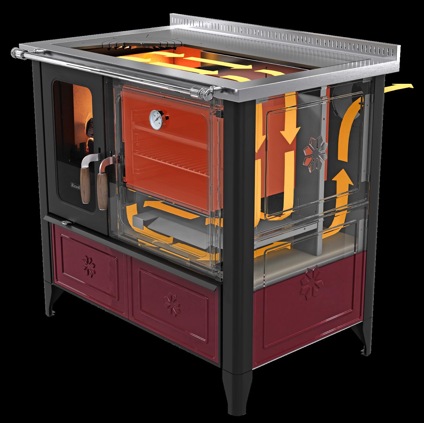 Il segreto dei forni delle cucine e termocucine a legna Rizzoli è tutto nell’accurato studio del doppio girofumi con elevata quantità di materiale refrattario che permette di ottenere cotture omogenee oltre i 350° e di portare in temperatura il forno in tempi record. Il particolare girofumi con lunghezza media pari a 270 cm avvolge il forno su tutti i lati (anche posteriormente), trattenendo maggiormente il calore all’interno della cucina a legna e garantendo cotture perfette con maggiori performance in termini di rendimento. Il tutto, grazie anche ai 4 distinti livelli di cottura. Le dotazioni del forno sono al top del mercato: termometro, griglia, teglia stampata e smaltata, guide telescopiche, valvola di eccesso vapore e una porta forno con ampio vetro serigrafato, singolo o doppio.