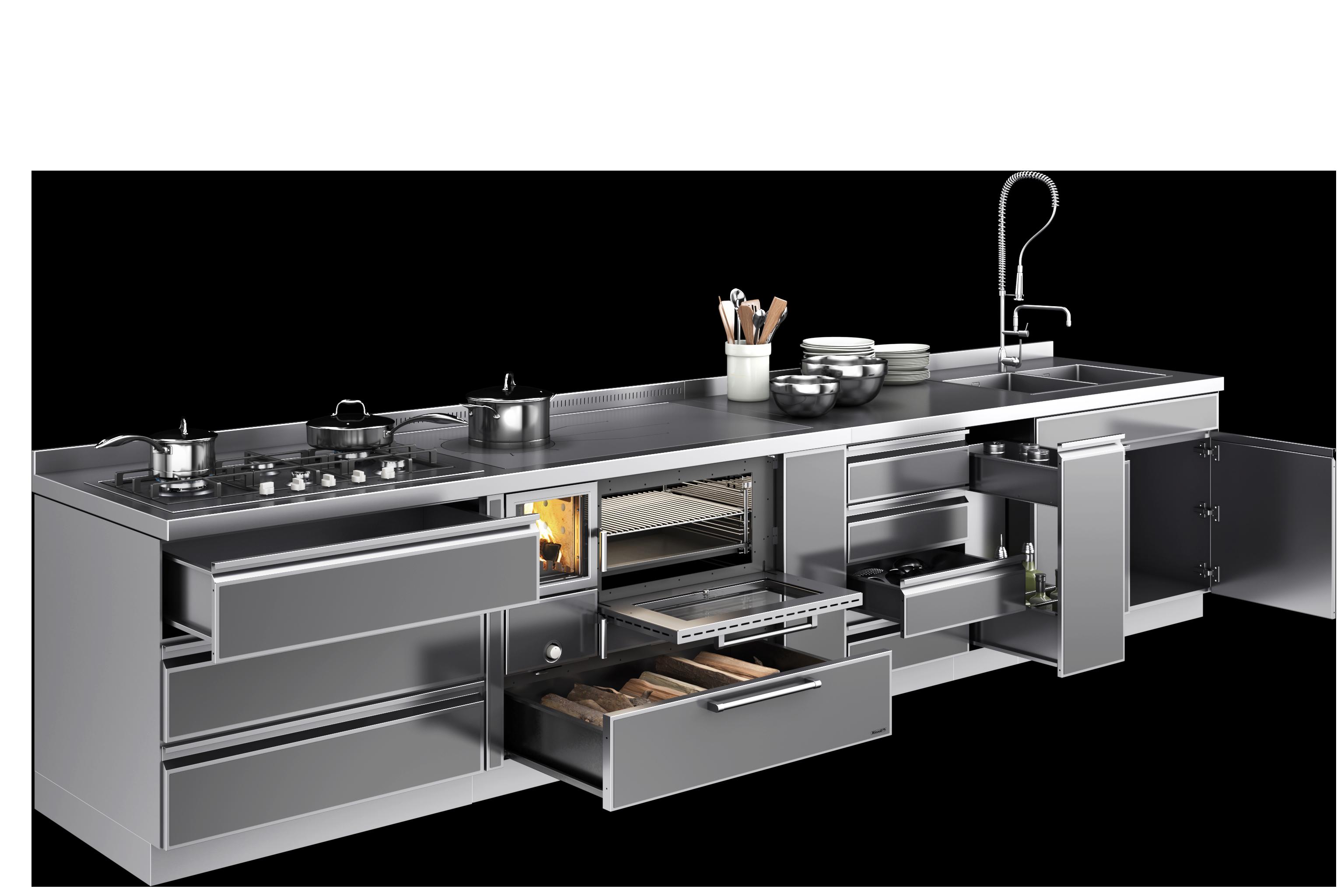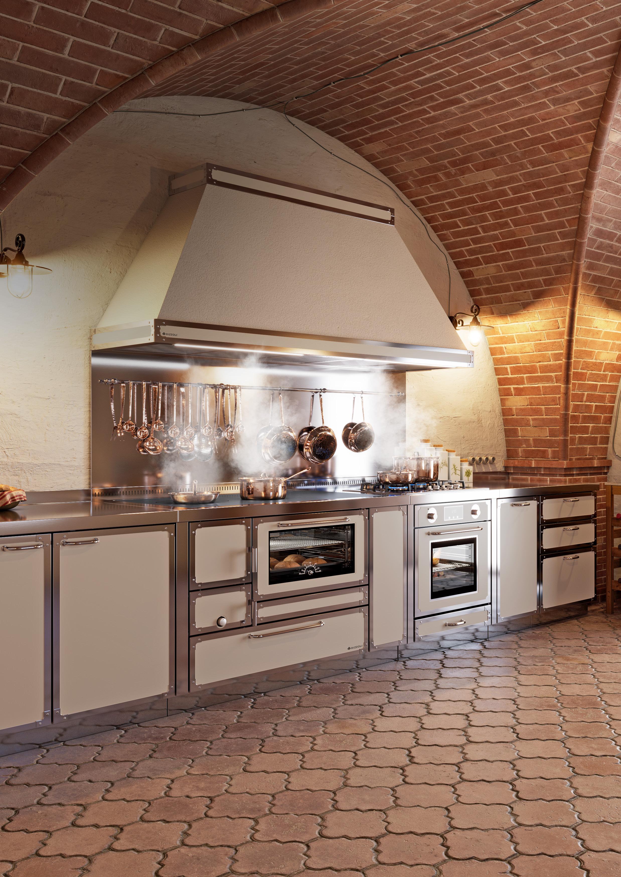 A completamento dei monoblocchi Rizzoli propone lavelli, mobili, pensili, piani realizzati in acciao inox su misura, che possono essere rifiniti con la stessa finitura della cucina e termocucina a legna. Tipicamente abbinabili ad una cappa di aspirazione Rizzoli, queste combinazioni donano un tocco di vera esclusività.