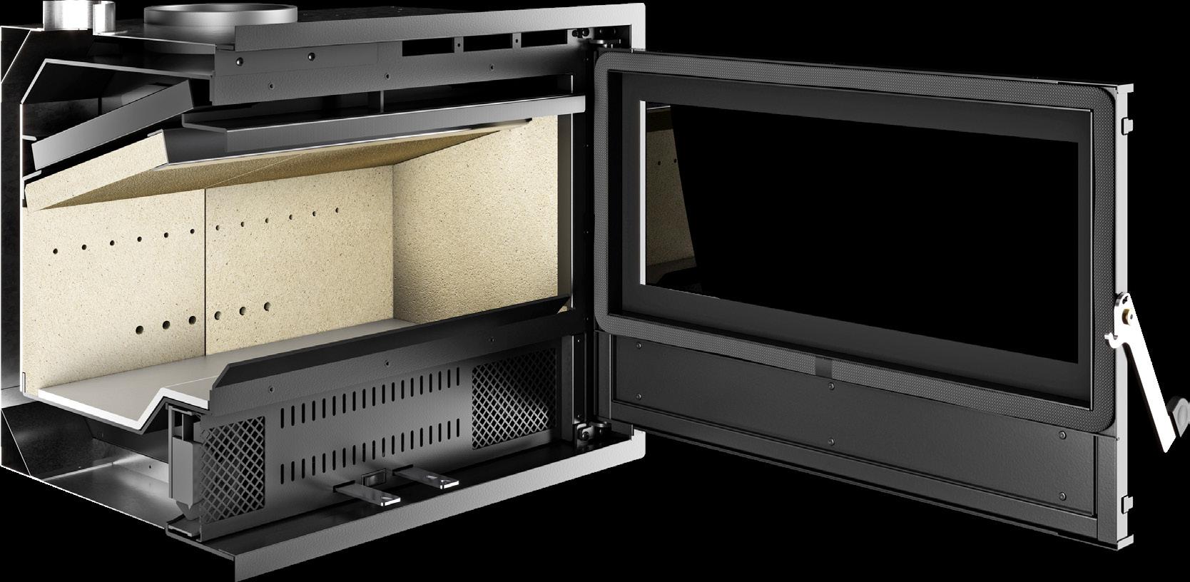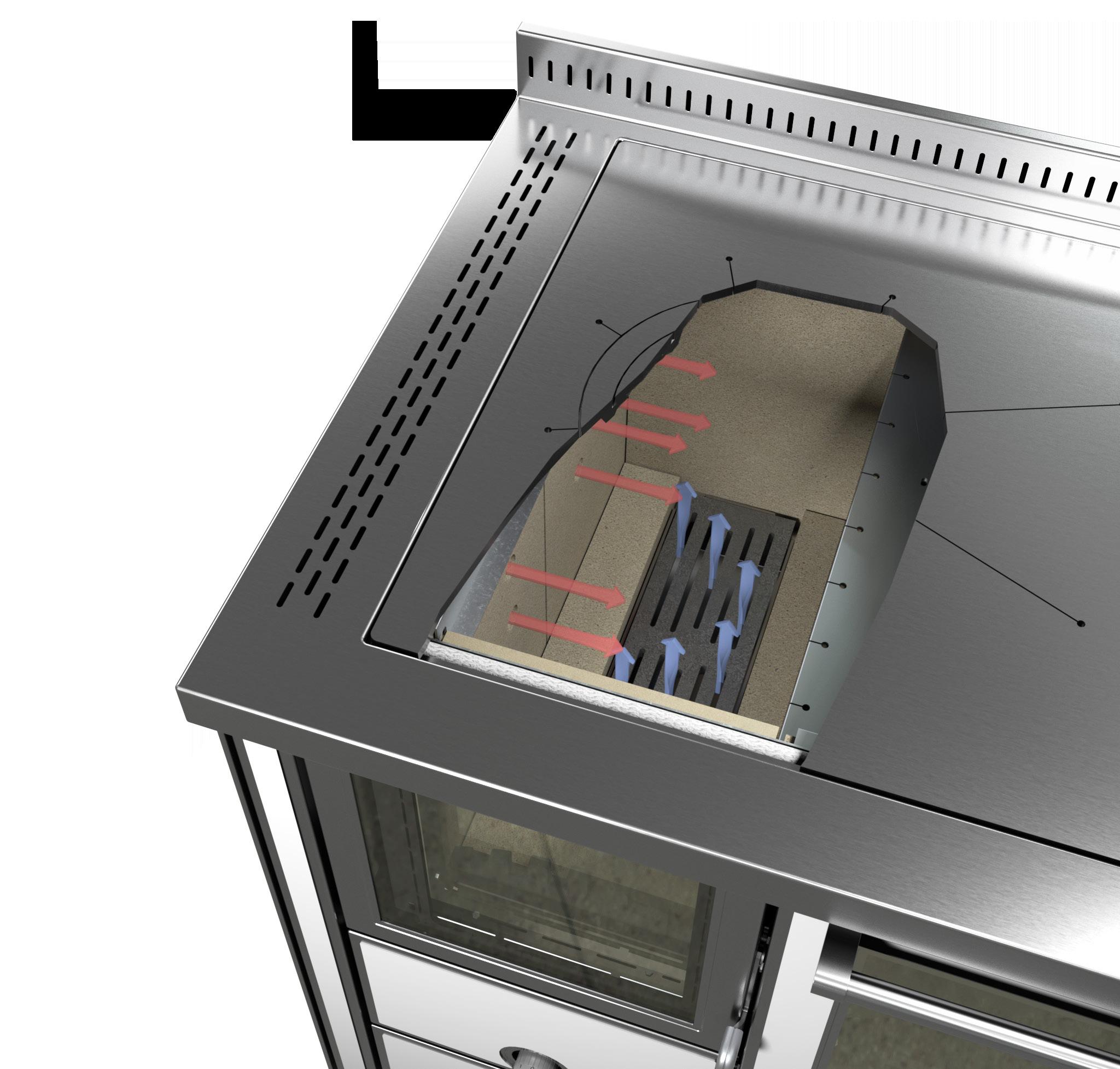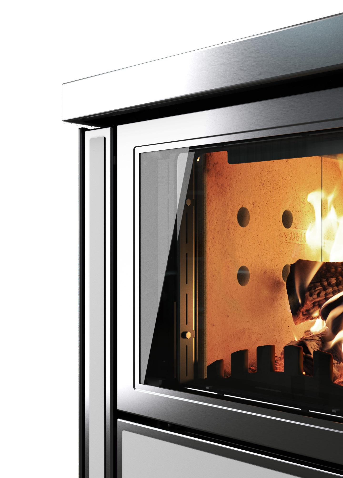 Sistema di combustioneSuperflame ® Porta fuoco con vetro ceramicoShiny Glass ® Porta fuoco con chiusura autom. di sicurezza Forno in acciaio inox Porta forno con doppio vetro e termometro Teglia su guide telescopiche
