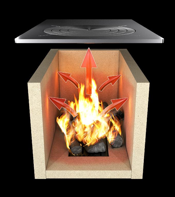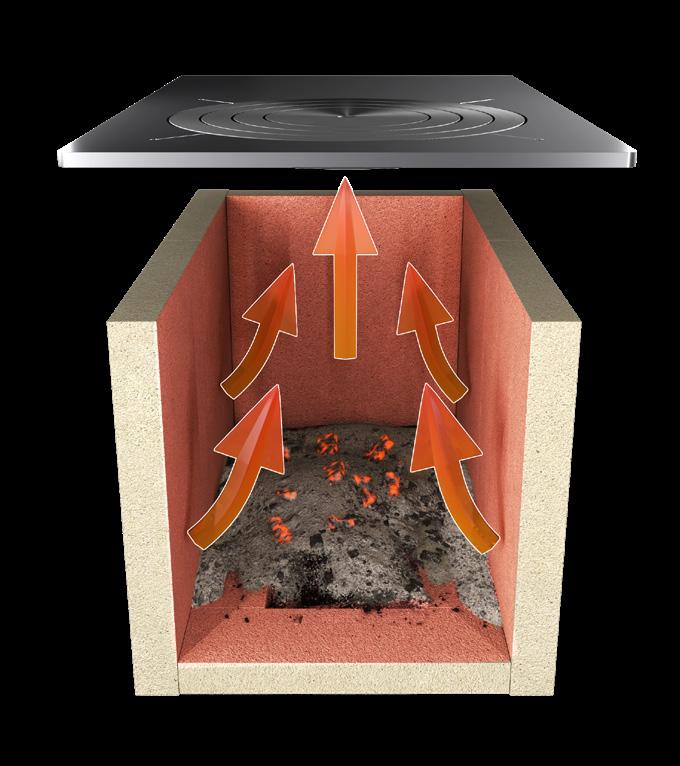 Questi eccellenti risultati sono ottenuti anche grazie alla grande quantità di materiale refrattario certificato presente nella camera di combustione e nel girofumi. L'elevato spessore del refrattario garantisce un notevole accumulo termico prodotto durante la combustione ed un rilascio costante e graduale nelle ore successive, anche quando il fuoco è già spento.