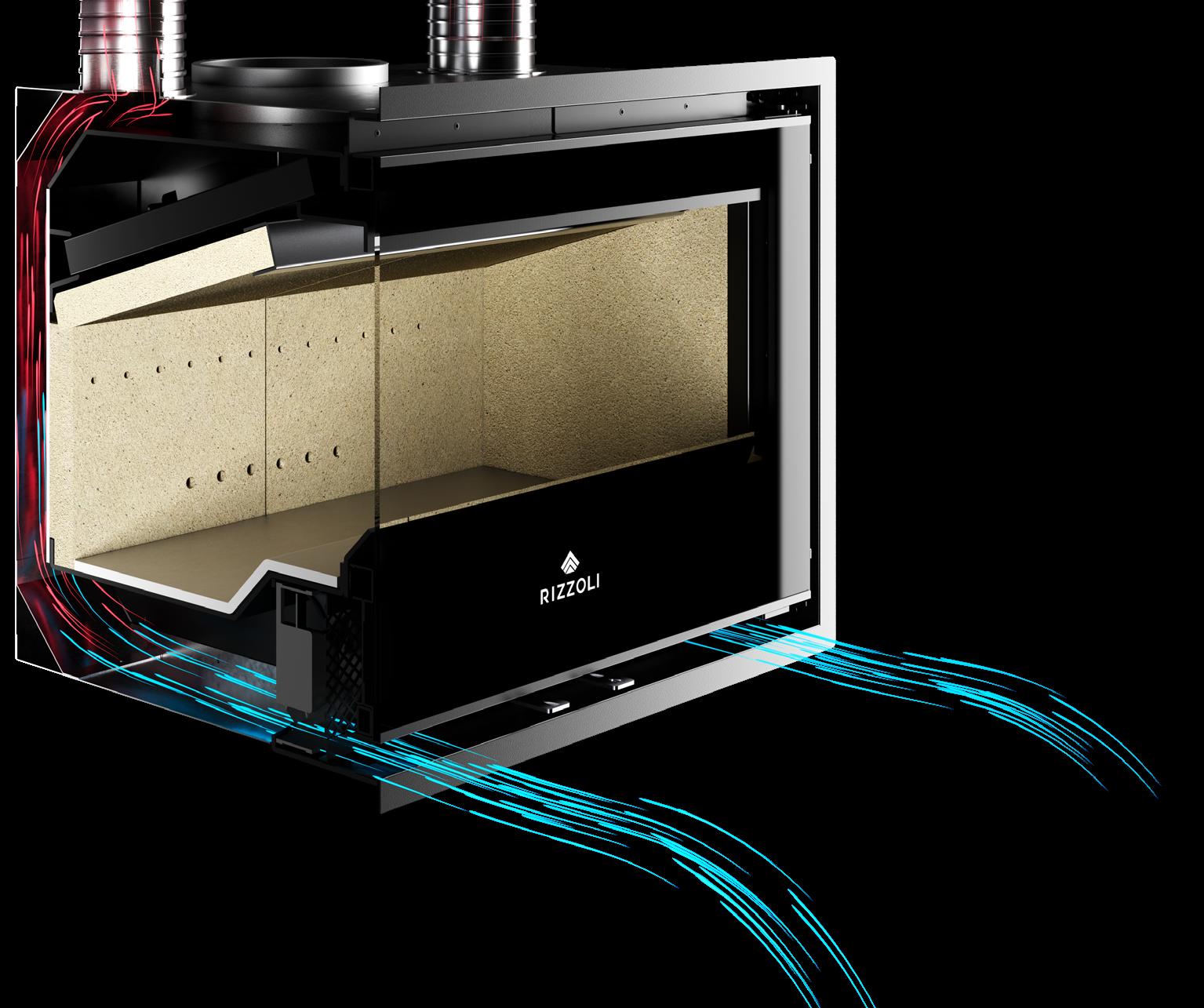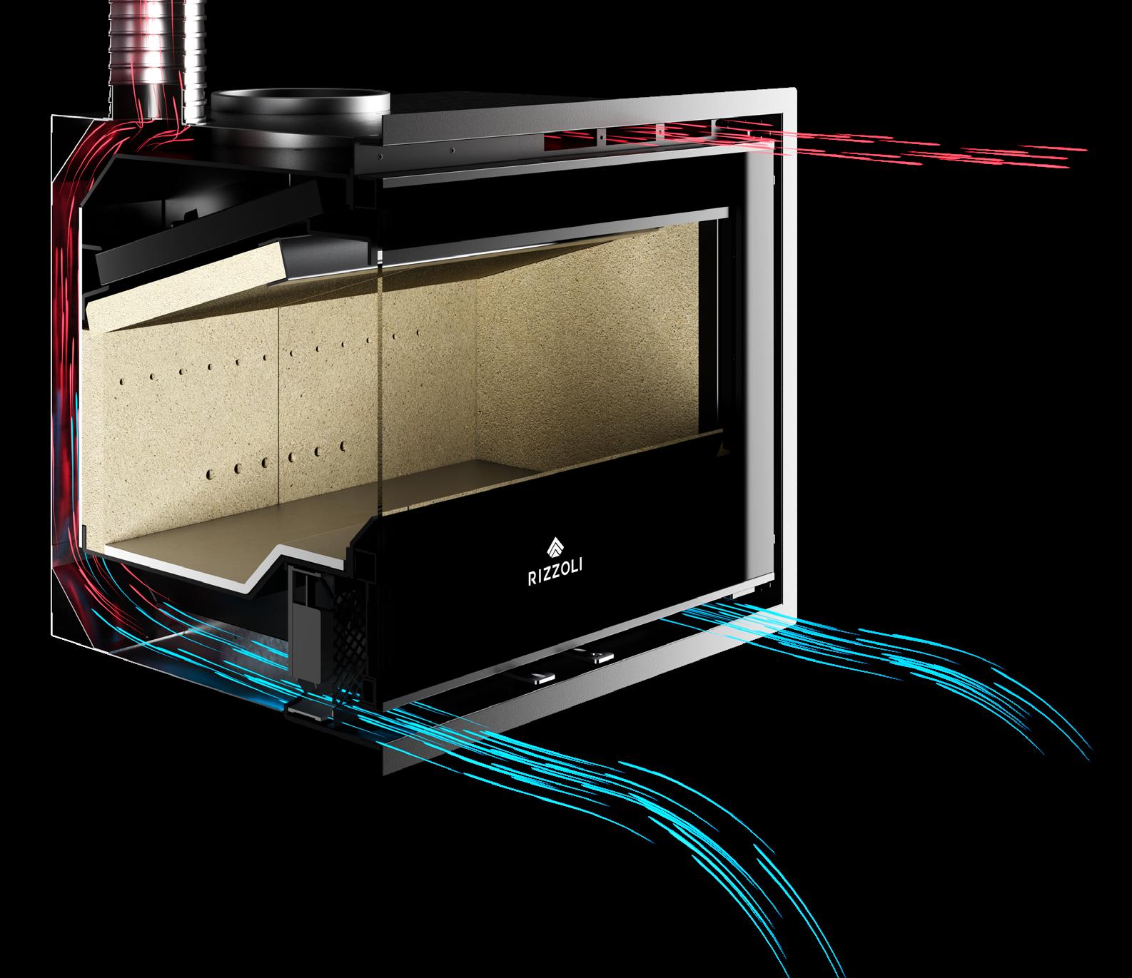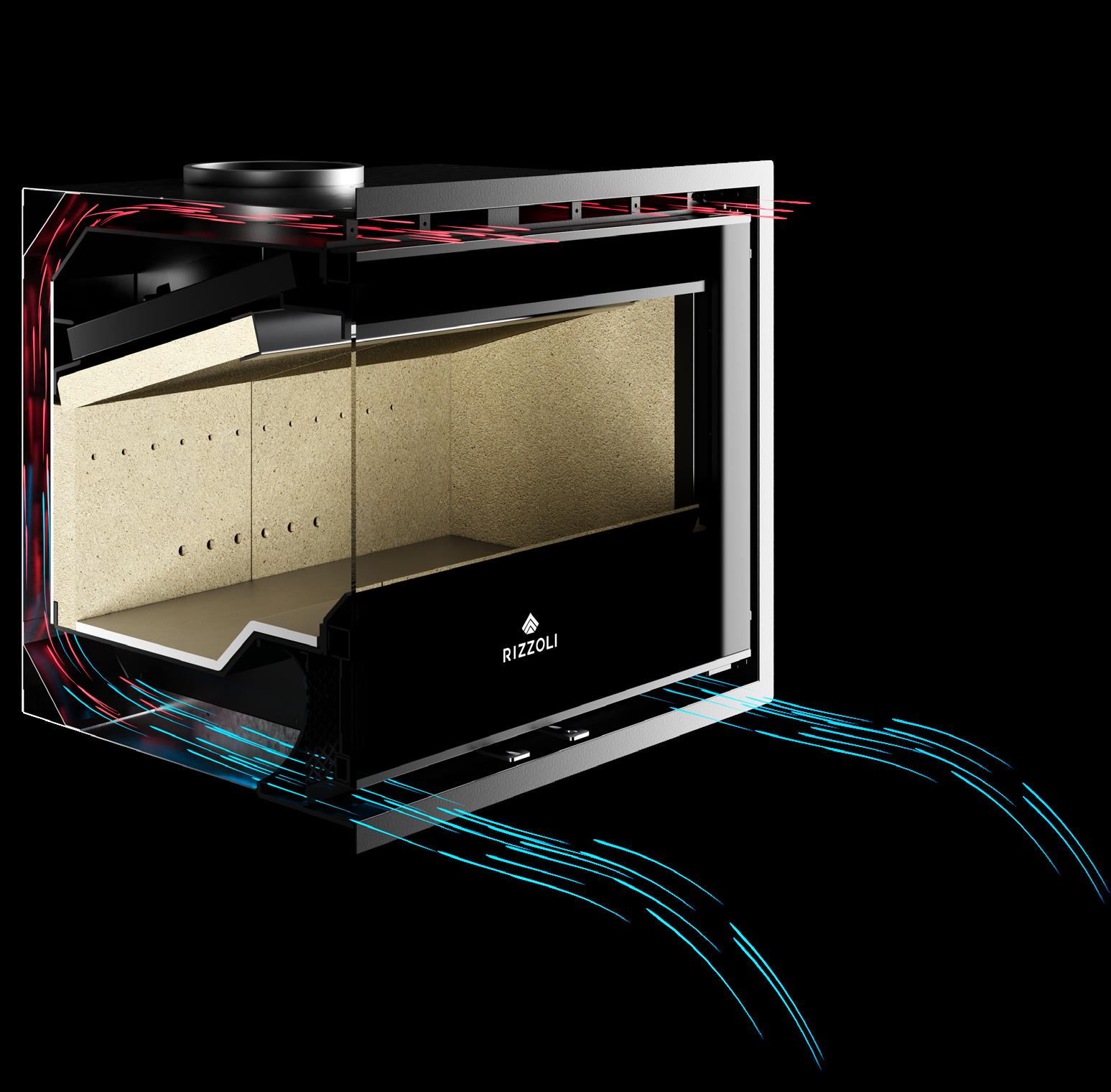 La camera di combustione delle cucine a legna Rizzoli è a tutti gli effetti il cuore del prodotto ed è realizzata con materiali refrattari di primissima qualità a cui Rizzoli tiene particolarmente. La camera è assemblata interamente a mano da esperti artigiani. I mattoni e le malte refrattarie che la compongono sono prodotti da aziende leader certificate. Il sistema di costruzione della camera di combustione prevede la completa copertura delle pareti con mattoni di alto spessore molto resistenti. Grazie alla particolare struttura ed ergonomia della camera di combustione e all’elevata efficienza della piastra radiante in acciaio speciale posta sopra di essa, si ottengono prestazioni superiori, rapidità nella cottura dei cibi e abbattimento radicale delle emissioni in atmosfera. Altro fondamentale aspetto presente nelle cucine a legna Rizzoli è l’abbondante strato di materiale refrattario che viene colato sotto il forno. Questo accorgimento aumenta considerevolmente le prestazioni del forno e in generale del calore generato dalla cucina a legna con un rilascio costante e graduale nelle ore successive, anche quando il fuoco è già spento.