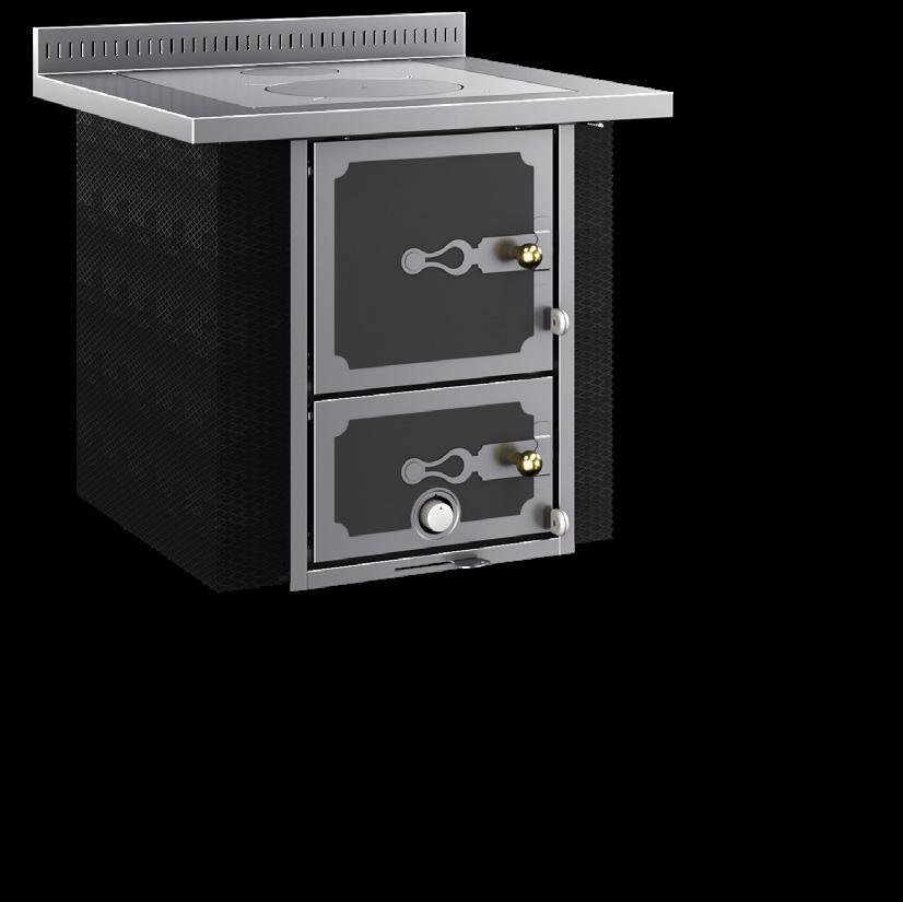 Presa aria esterna Regolazione automatica aria primaria Aria secondaria preriscaldata Uscita fumi posteriore regolabile Piedini livellatori regolabili in altezza Distanziali integrati Porta forno con doppio vetro e termometro Forno in acciaio inox con illuminazione elettrica Teglia e griglia Vasca acqua