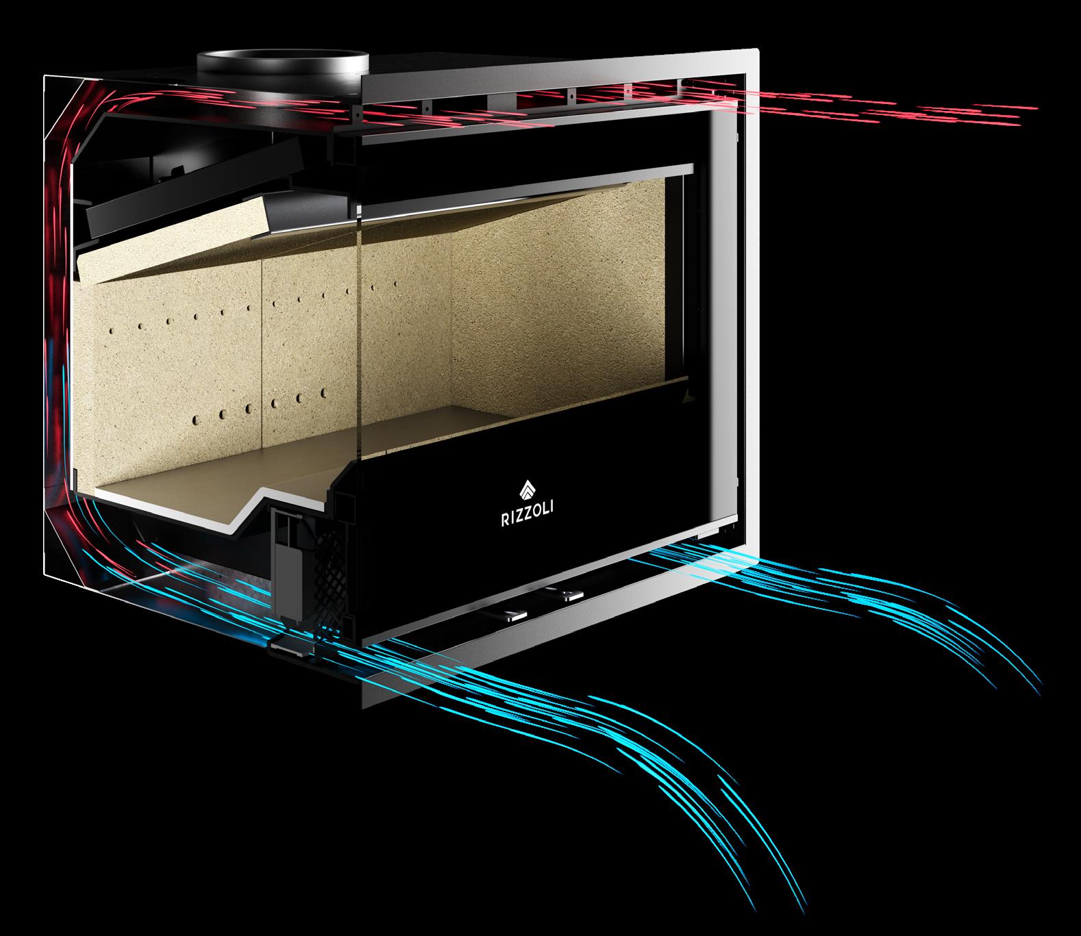 SURROUND ® Le cucine a legna Serie RI e RVI, sono state progettate per l’installazione tra i mobili in massima sicurezza. Il segreto di queste Serie è il sistema Surround Heat®, ideato dal laboratorio Ricerca & Sviluppo Rizzoli per risolvere qualsiasi problema d’installazione tra i mobili. Il sistema certificato di abbattimento del calore utilizza materiali isolanti di ultima generazione che integrati a tecnologici dissipatori di calore garantiscono un ottimo isolamento, riducendo la distanza di sicurezza laterale da materiali infiammabili a solo 1 mm.