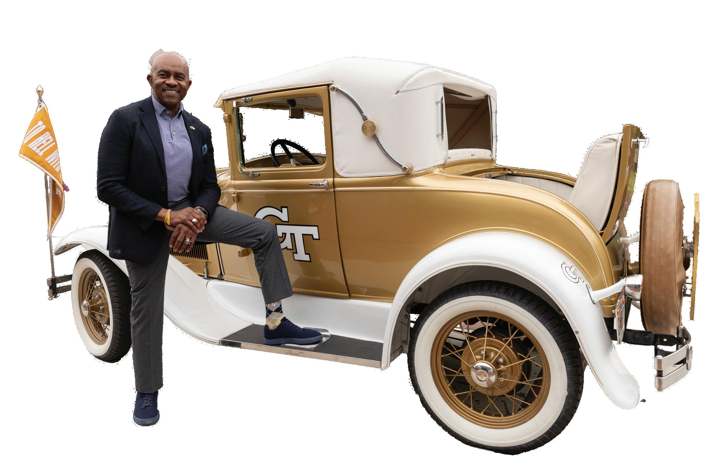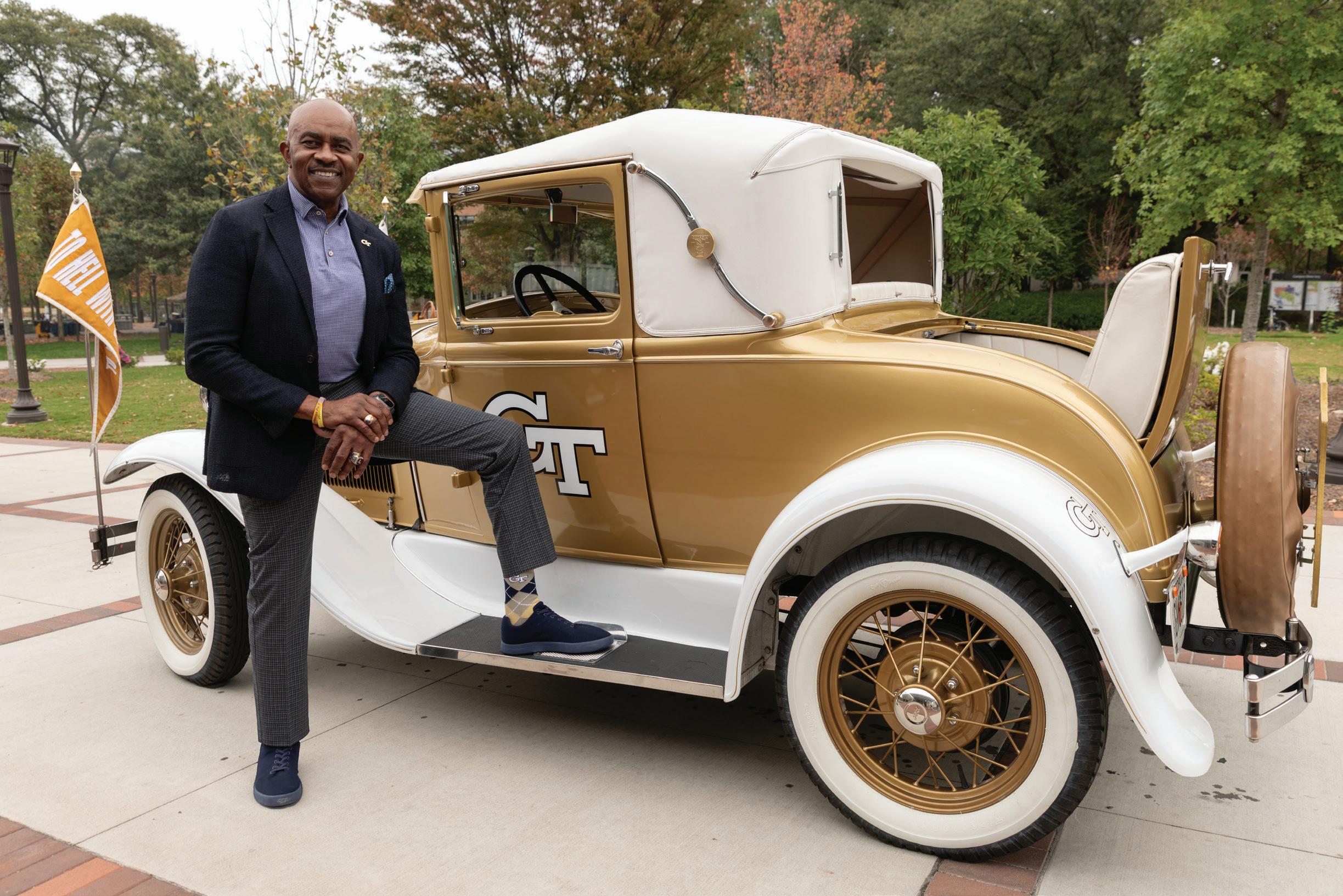 Ron Johnson strikes a pose in the iconic “Ramblin’ Wreck”—a 1930 Ford Model Sport coupe that serves as the official mascot of the student body at the Georgia Institute of Technology.