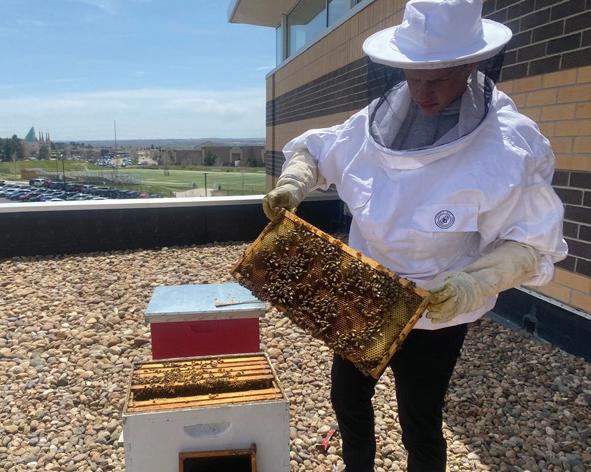 Just a few steps behind Mr. Beasley on the edge of the boy’s division roof, junior Sam Koch opens a crate home to over a hundred bees and one royal queen. Despite the colony’s impressive size, it isn’t widely known that Regis Jesuit has housed a group of bees on the rooftop for the past few years. The colony began after student Brodie Halker mentioned the idea to Principal Jimmy Tricco, who immediately supported the ingenious idea. The hive has been a proactive step for the RJ community to help the environment and teach students about bees’ critical role in our ecosystem. Additionally, a business run by Koch sells honey from Regis Jesuit’s rooftop colony and has been expanding its beehive count every year.