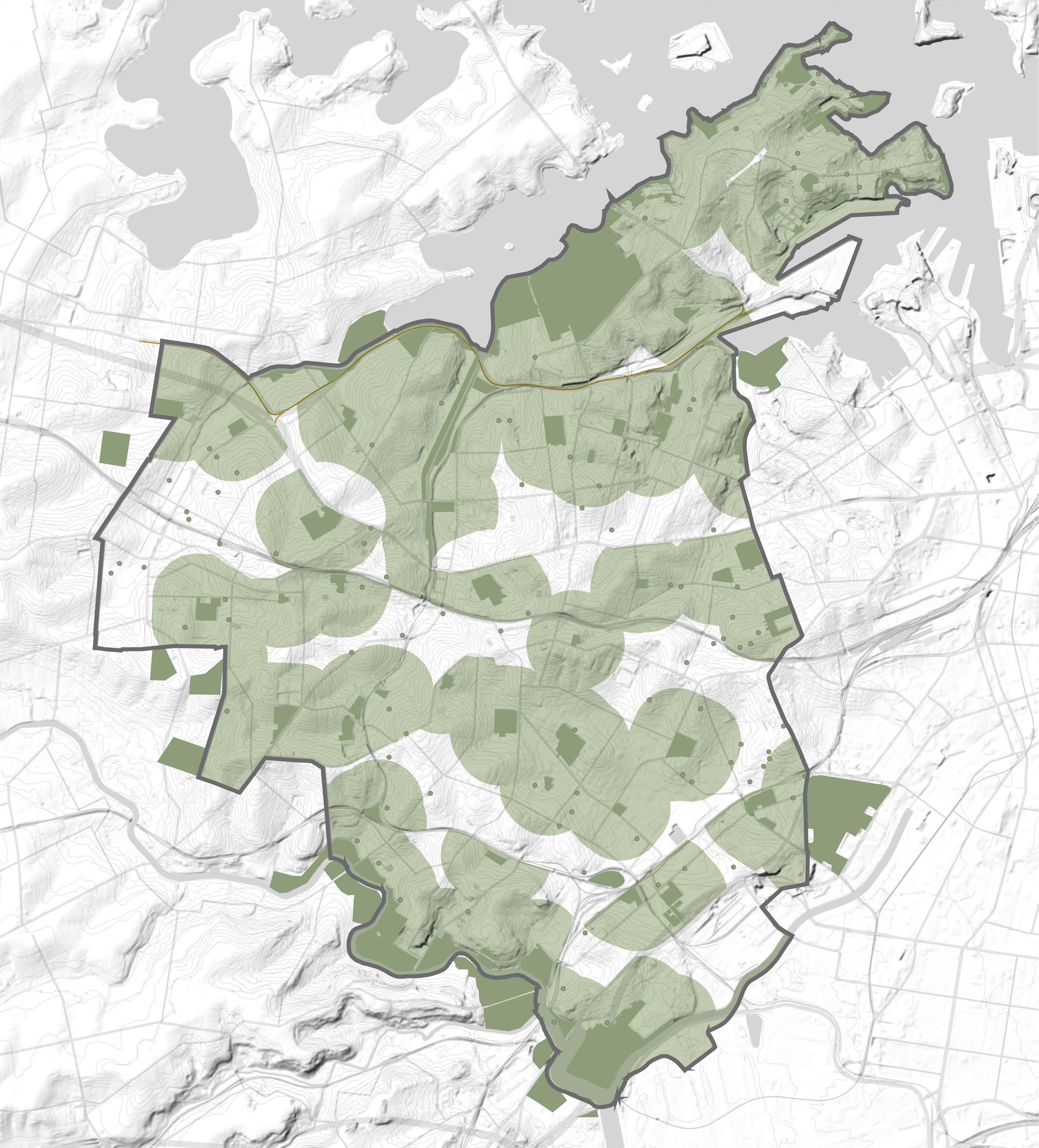 Perimeters of major parks were offset to find ~400m of walkable distance from the perimeter from the parks without major barriers such as main roads and train lines which prevent ease of pedestrian accessibility.