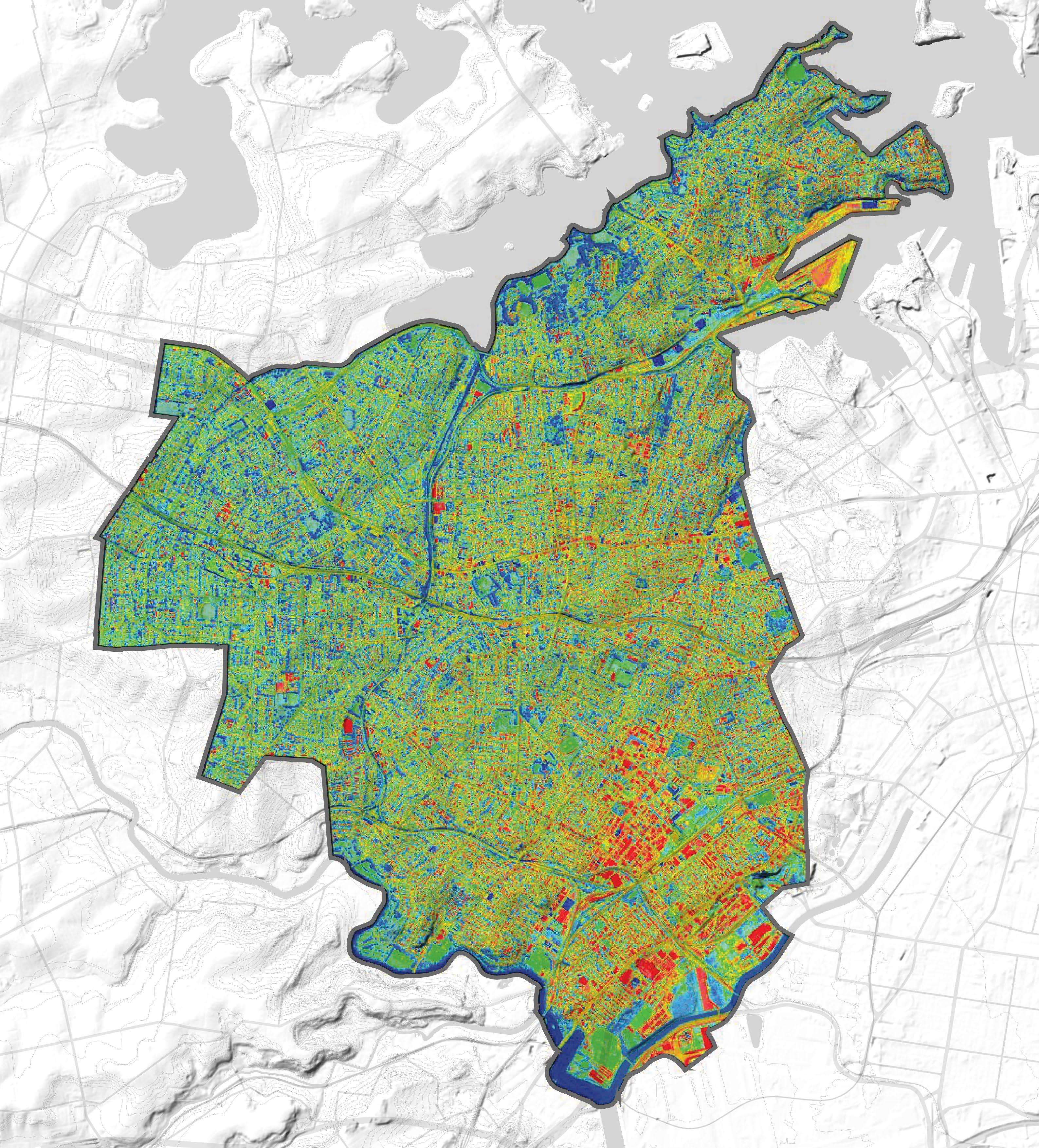 This in turn begins to show which areas benefit from a strong existing presence of greenery and which areas heavily lack green open spaces.