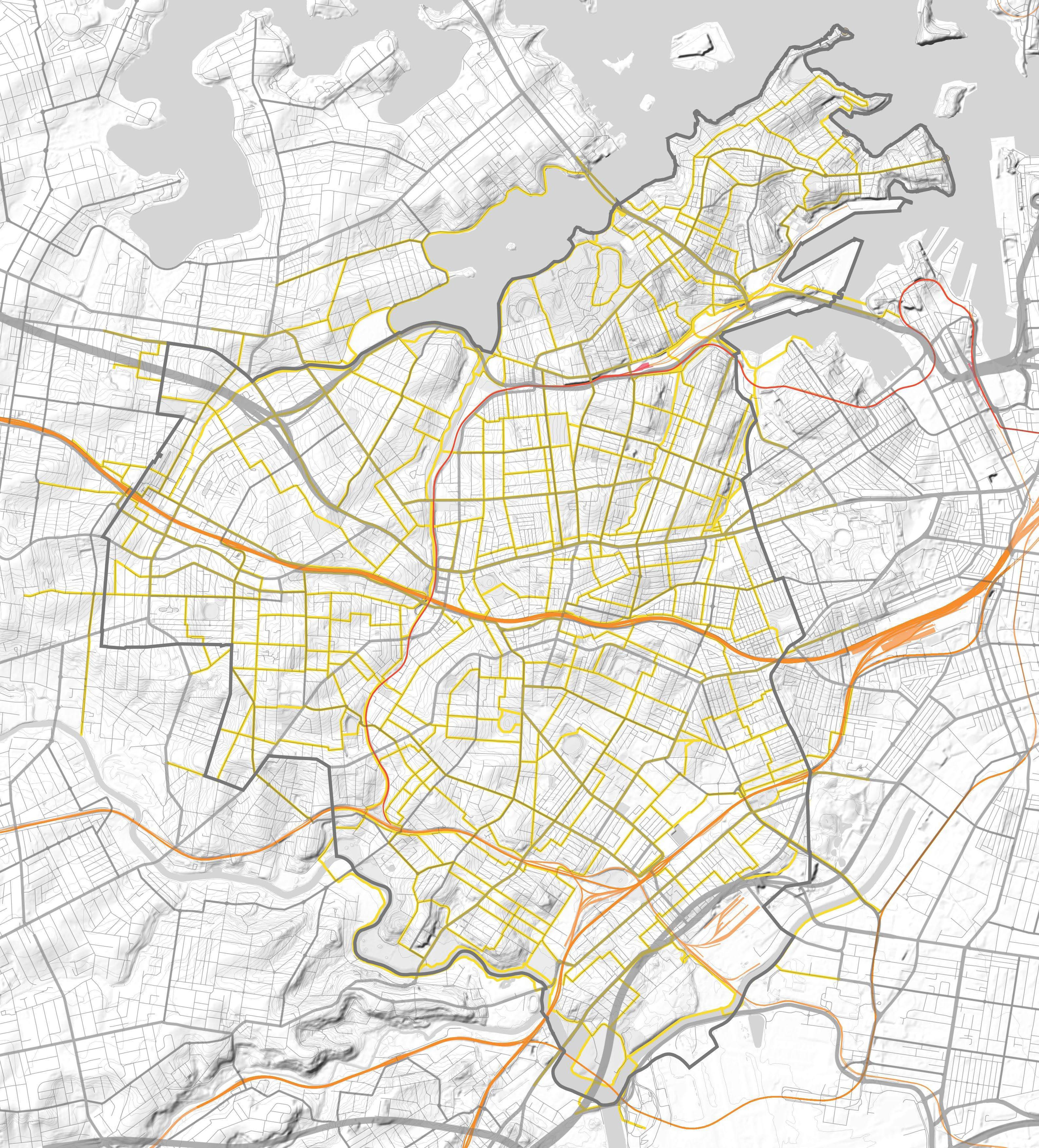 The Blue-Green Grid will go through commonly used routes. This map uses GPS data which mapped locations of people at different times of the day. A heat map was then created using an algorithm that identifies multiple data sets in high location concentration.