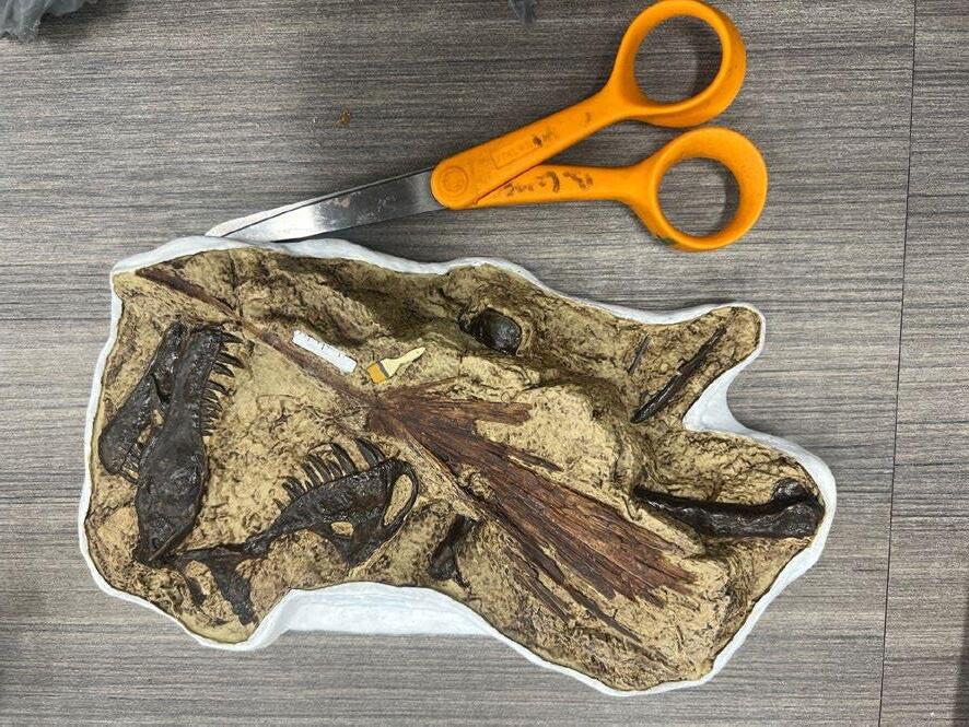 The next stop was in the Digital Research Lab which had, among other instruments and technologies, a 3D printer which produces hand specimens that can be analyzed more easily. Figure 5 shows a miniature copy of Teen Rex. Even with a slightly different orientation from the photo in Figure 4, there is no difficulty in identifying the jaws and the palm frond.