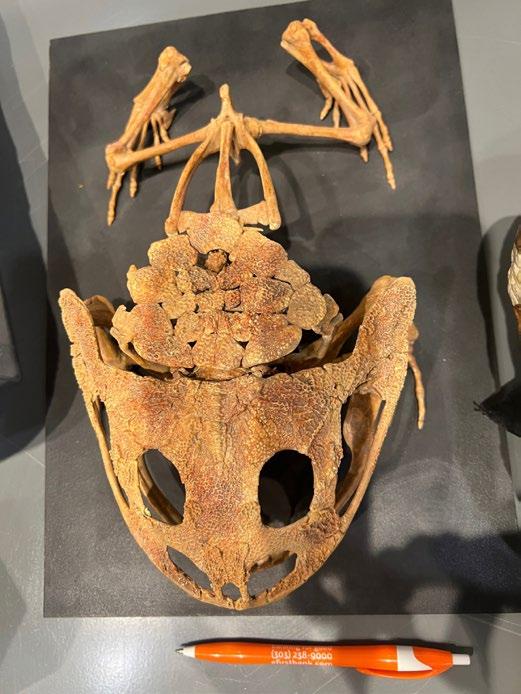There is yet another fossil vying for a description of ‘weird’ . . . or perhaps ‘terrifying’. Figure 7 shows the 16-inch, 9-pound frog, Beelzebufo ampinga, arguably the heaviest frog that ever lived. This ‘frog from hell’ existed as an ambush predator with a bite force of a lion, seen next to Dr. Krause waiting for a snack with its open mouth (Figure 8). Beelzebufo’s name is derived from Beelzebub (Greek for “devil”) and bufo (Latin for “toad”).