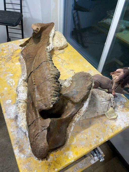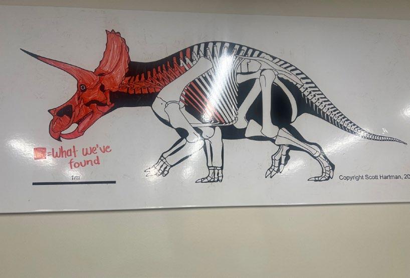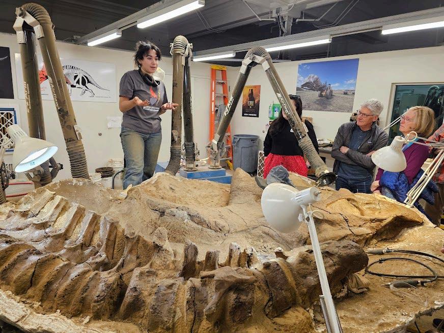 In early February, a small group of RMAG members were wowed by a tour, led by Dr. David W. Krause, Senior Curator of Vertebrate Paleontology, to view fossil collections in the bowels of the Denver Museum of Nature & Science (DMNS). Before we descended into the lower levels of the Museum, Dr. Krause introduced us to Evan Tamez-Galvan, Fossil Preparator, who described the Triceratops bones discovered in 2025 from the Late Cretaceous Hell Creek Formation on U.S. Forest Service land in North Dakota. The skeletal remains were transported in a 5.5-ton plaster jacket to the Museum where the process of removing the matrix from the bones is ongoing. So far, over 5000 pounds of matrix has been removed from the Triceratops skull, vertebrae, and ribs (Figure 1).