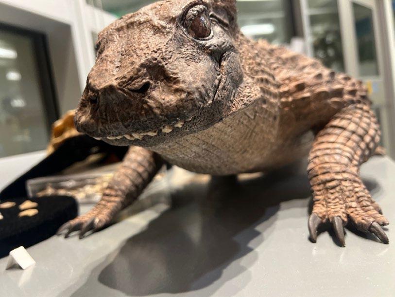 fossil is a replica of the pug-nosed crocodile Simosuchus clarki (Figure 6). This herbivorous, terrestrial creature was heavily armored with clove-shaped teeth, a pug nose, and bony eyelids. Are those eyelids uncomfortable?