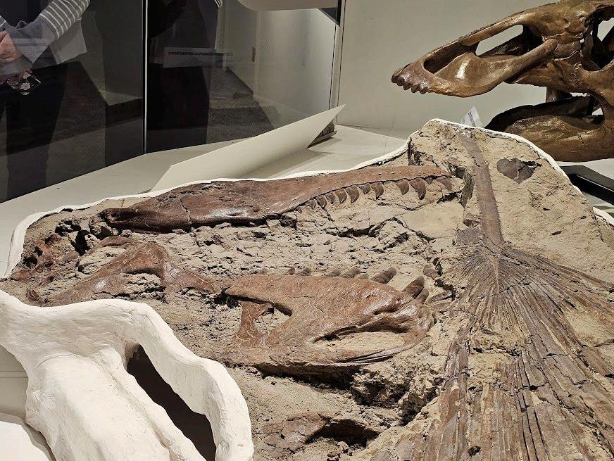 the Museum in a temporary exhibit is a rare subadult Tyrannosaurus rex specimen known as ‘Teen Rex’ (Figure 4). Note the well-preserved teeth from the upper and lower jaws adjacent to a palm frond. Found in 2023, a 6,000-pound plaster jacket was removed via helicopter that included parts of the skull, including the upper and lower jaws with many teeth, tail, hind leg, and pelvis. The dinosaur itself may have weighed as much as 3,500 pounds. Additional work has been done to expose the tibia, fibula, and femur.