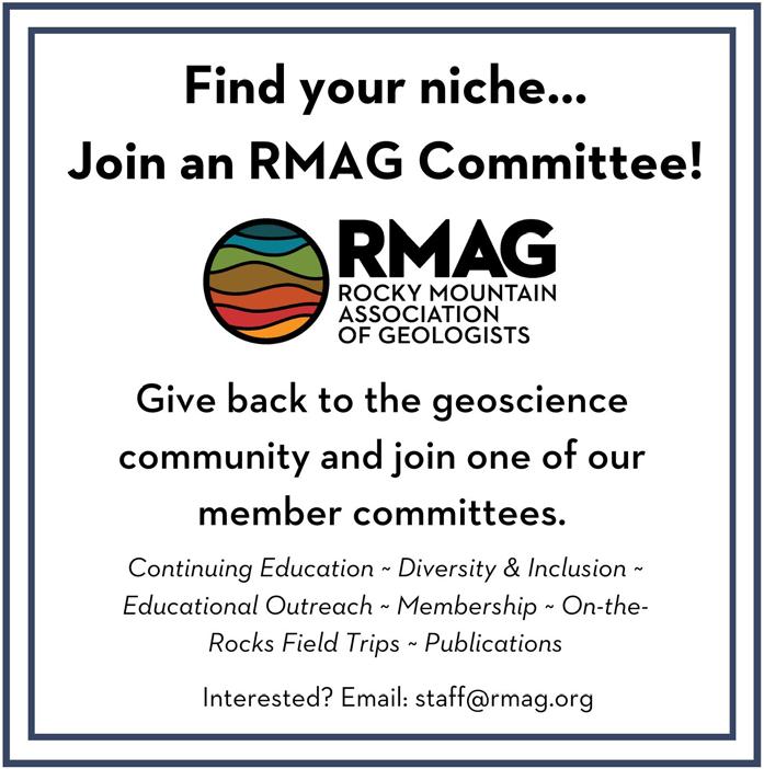 The Rocky Mountain Association of Geologists (RMAG) is a nonprofit organization whose purposes are to promote interest in geology and allied sciences and their practical application, to foster scientific research and to encourage fellowship and cooperation among its members. The Outcrop is a monthly publication of the RMAG. 730 17th Street, B1, Denver, CO 80202 • 720-672-9898