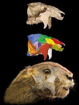 Another significant scientific discovery in Madagascar was the 2010 discovery of a skull of the 20-pound, groundhog-like Vintana sertichi, now recognized as a distinct new genus and species (Figure 9). Vintana means luck in the Malagasy language, and that luck was bestowed upon the discoverer of this fossil, one of Dr. Krause’s former graduate students. In 2014, micro-CT (computed tomography) scanning, published by Dr. Krause and colleagues), revealed the details of this skull. It measured almost five inches long, twice the size of any previously known mammalian skulls from Gondwana during the time of dinosaurs (Figure 10). 1 The extraordinary research done on this skull has yielded several professional papers and extensive information about the cranium which, of course, include ‘weird’ features such as “enlarged flanges for attachment of chewing muscles, a strangely tilted braincase, and large eye sockets”.1 The assortment of colors on the CT scan in the middle of Figure 10 illustrates the various bones of the cranium.
