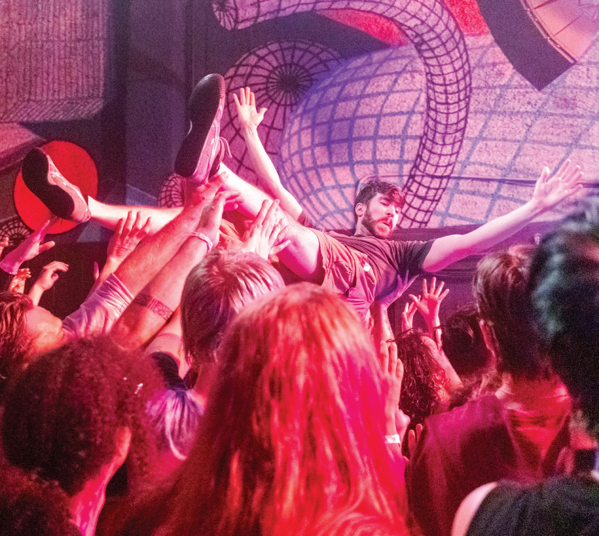 (Above) Mike Davis, drummer and backing vocalist for Chess at Breakfast, crowd surfs during the Farewell World Tour concert at the Aggie Theatre July 2, 2021.